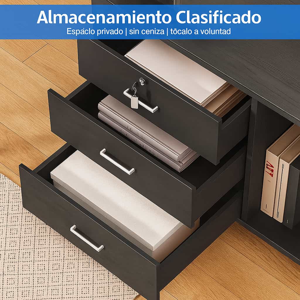 - Tres cajones con tiradores metálicos y un compartimento lateral con puerta.