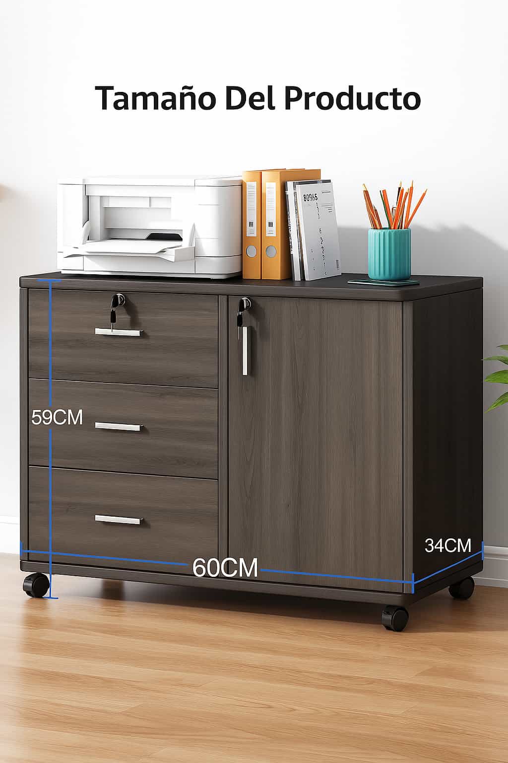 Archivador móvil de estilo moderno con acabado en tono nogal oscuro, ideal para oficinas o espacios de trabajo. Combina funcionalidad y estética con un diseño compacto que integra tres cajones amplios y un compartimento con puerta lateral para almacenamiento adicional. Su superficie superior es perfecta para colocar impresoras, libros o accesorios de oficina, y sus ruedas permiten moverlo fácilmente según las necesidades del espacio.