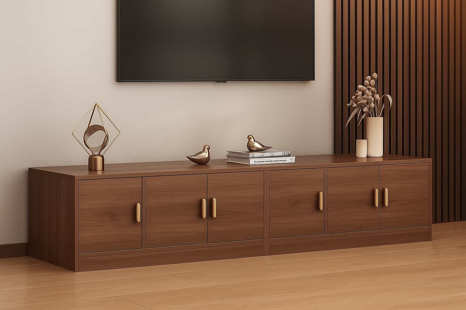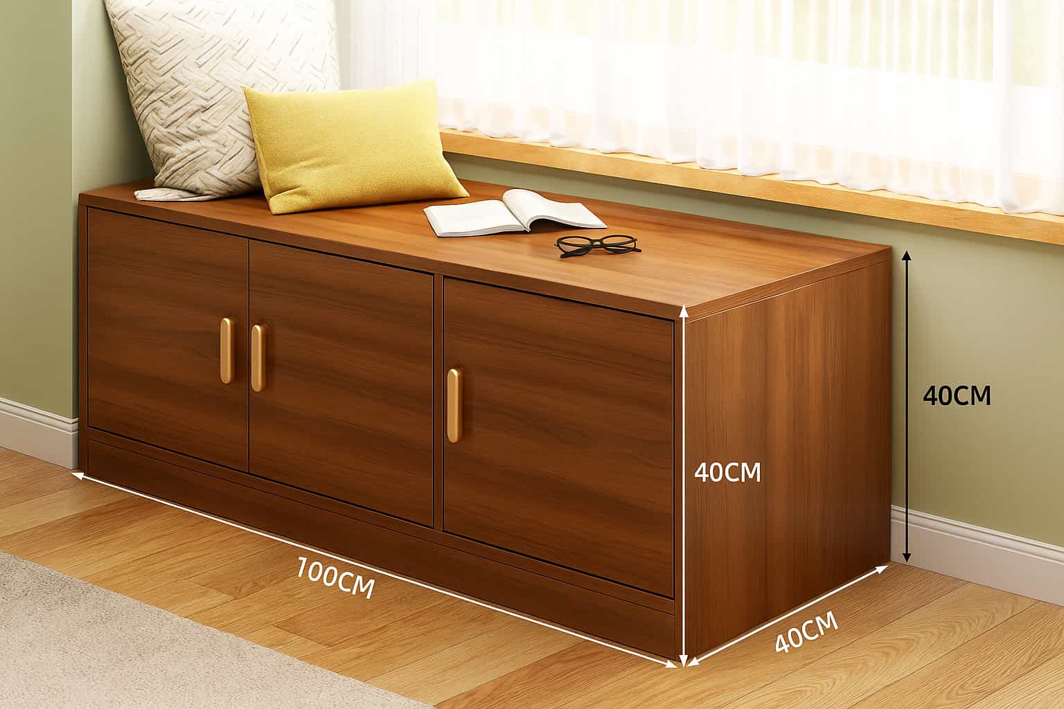 Banco organizador de diseño moderno y funcional, ideal para pasillos, dormitorios o salas de estar. Su estructura rectangular ofrece un estilo minimalista con líneas limpias y acabados cálidos en tono madera natural. Dispone de tres compartimientos con puertas abatibles que brindan amplio espacio para guardar zapatos, libros o accesorios del hogar, manteniendo el orden sin perder elegancia. Su superficie superior puede utilizarse como asiento o como mesa auxiliar decorativa.