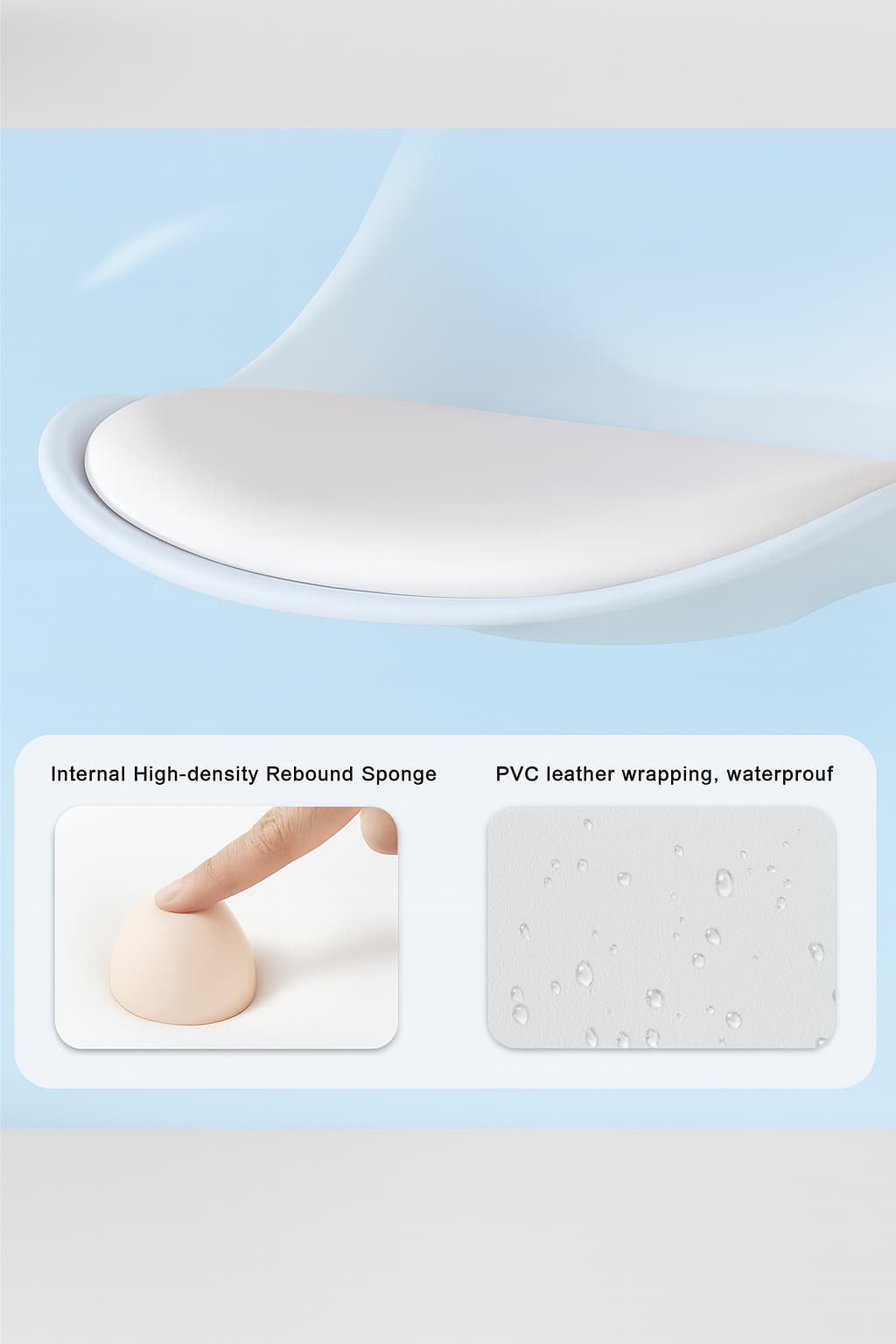 Asiento en acrílico transparente de alta resistencia, base en acero cromado con sistema hidráulico y cojín tapizado en cuero sintético blanco.
