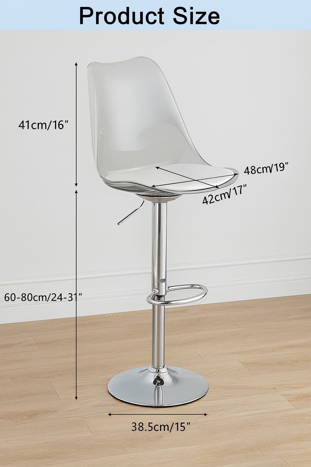 Banco alto transparente de diseño moderno con estructura ajustable, ideal para cocinas, barras o espacios contemporáneos. Su asiento de acrílico transparente ofrece una estética ligera y elegante, permitiendo integrarse fácilmente en cualquier ambiente sin recargar el espacio visual. El asiento incorpora un cojín acolchado blanco para mayor comodidad, mientras que la base metálica cromada proporciona estabilidad y brillo. El sistema de ajuste de altura y el reposapiés integrado hacen de este banco una opción funcional y ergonómica con un toque sofisticado.