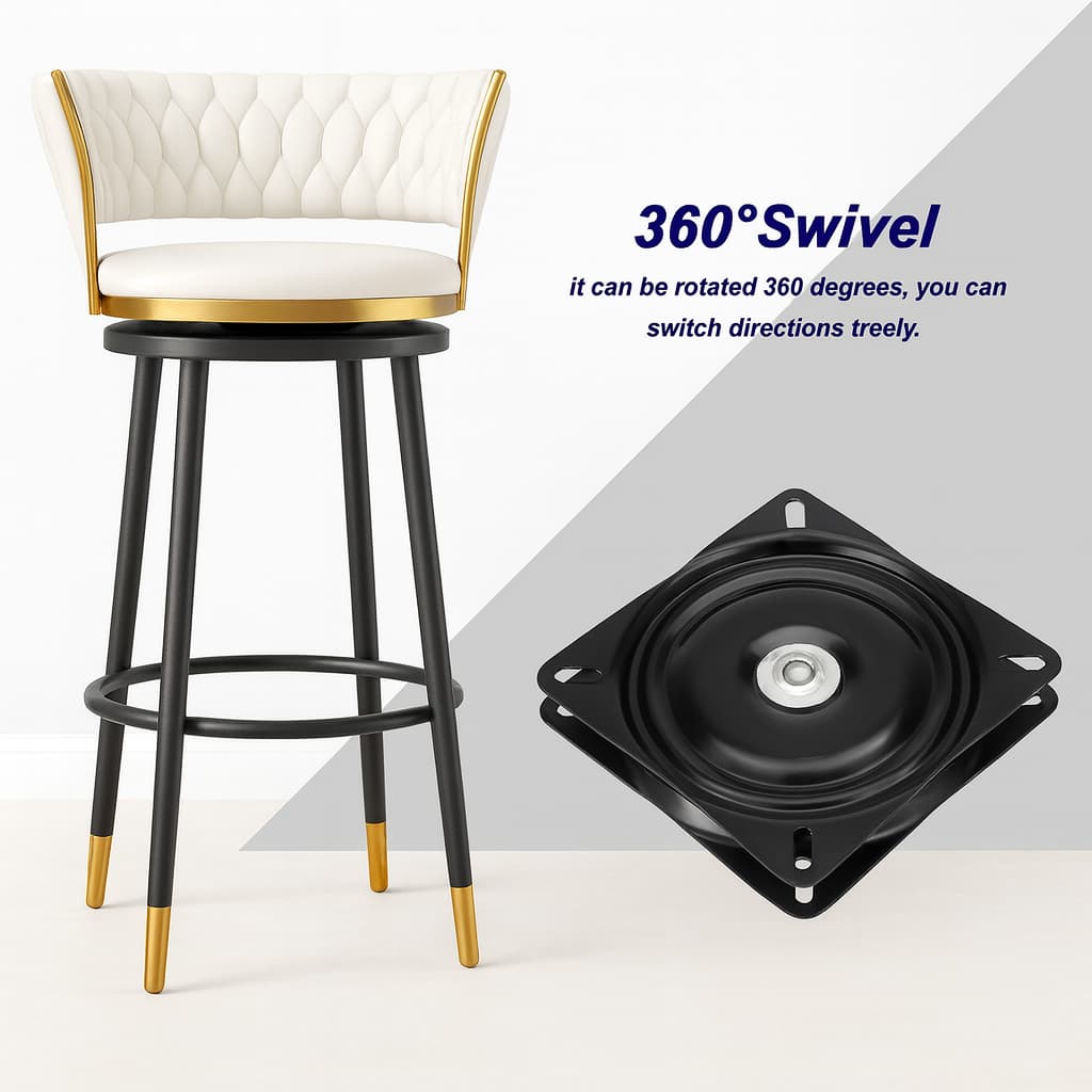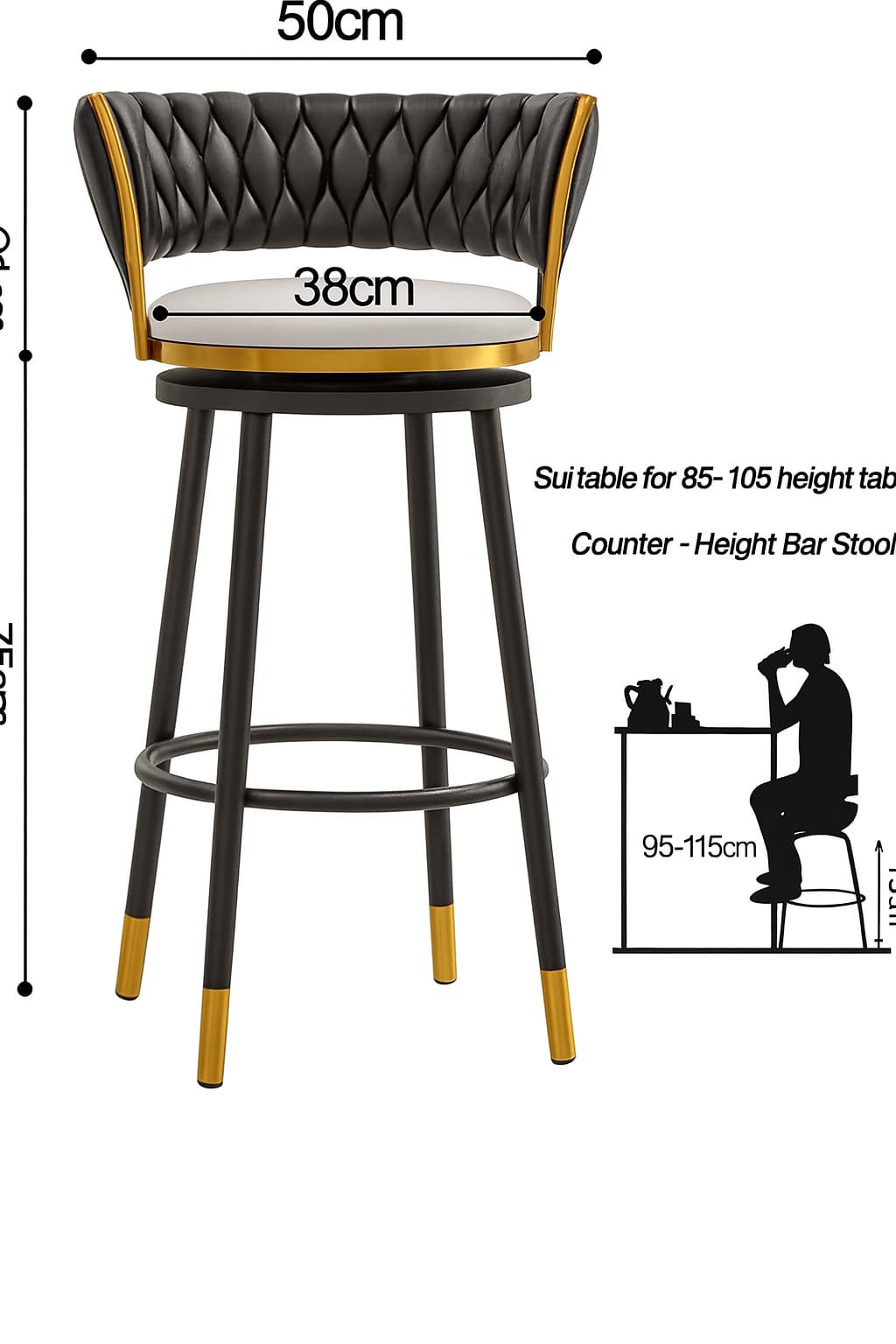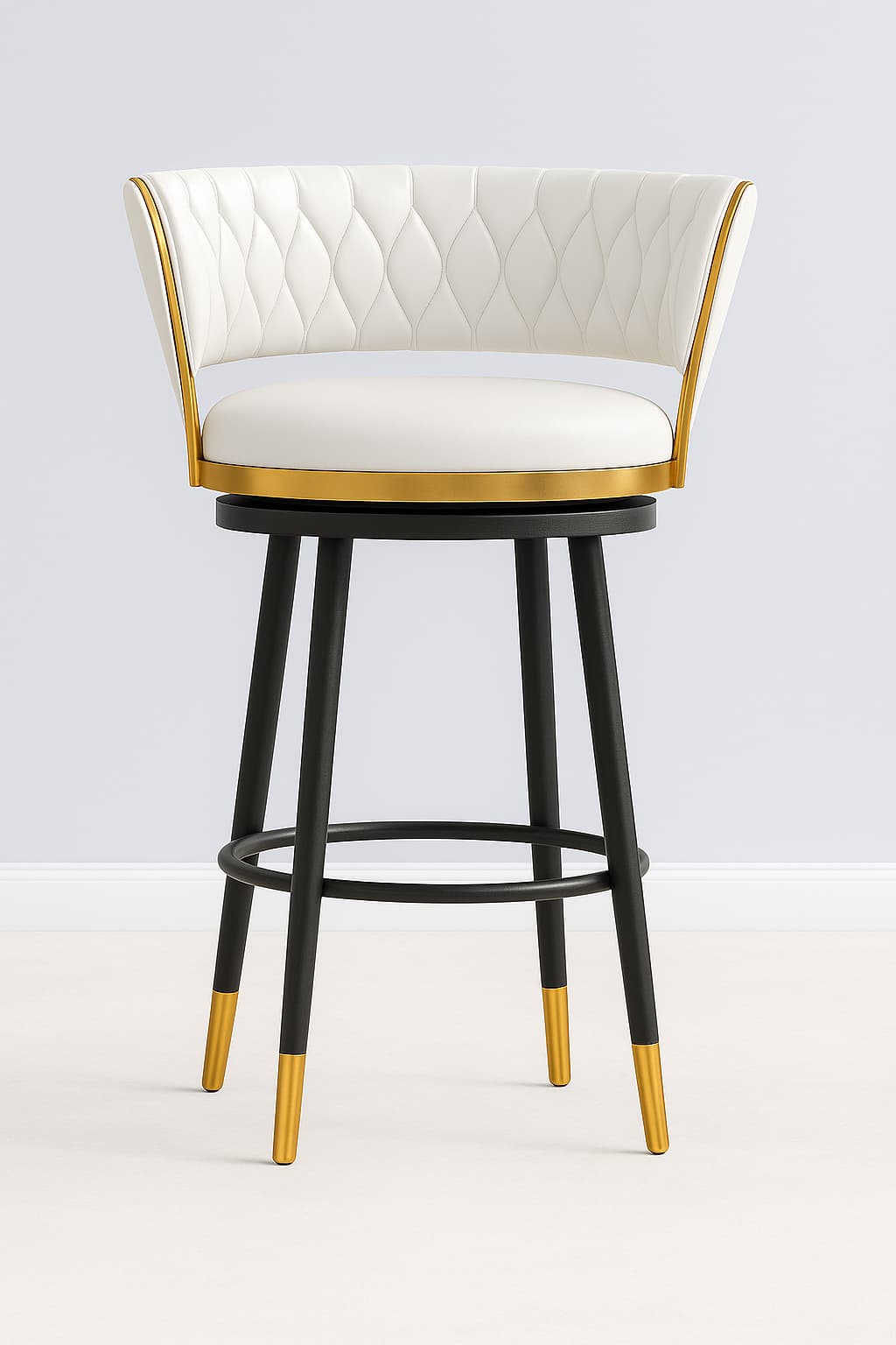 Banco alto de diseño elegante y contemporáneo, ideal para barras, cocinas modernas o espacios de lujo. Su estructura combina materiales de alta calidad con una estética sofisticada: el asiento y el respaldo están tapizados en vinil con un patrón capitoné trenzado que aporta textura y distinción, mientras que los detalles metálicos dorados realzan su diseño con un toque glamuroso. Las patas cónicas en color negro con terminaciones doradas brindan estabilidad y estilo, acompañadas de un reposapiés metálico que garantiza comodidad durante su uso.