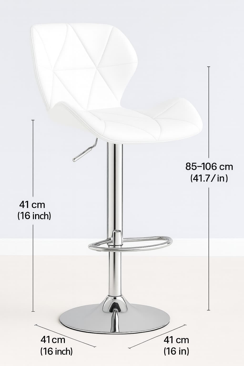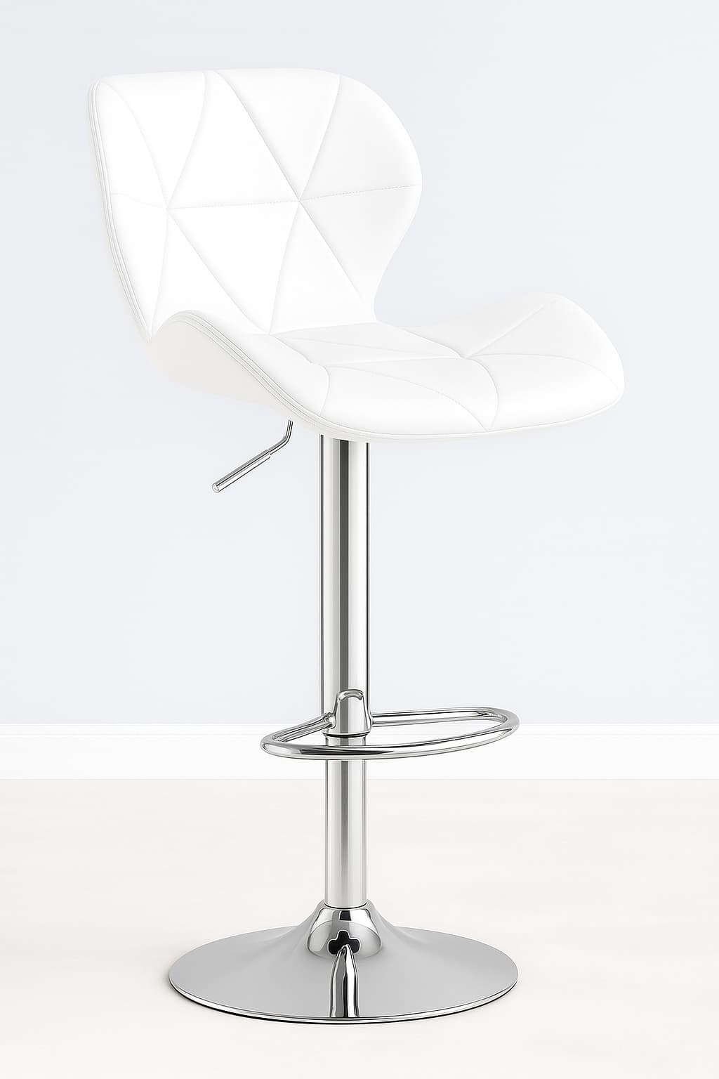 Banco alto de diseño moderno y ergonómico con asiento tapizado en cuero sintético y base metálica cromada. Su respaldo curvado con costuras geométricas ofrece un soporte cómodo y elegante, ideal para cocinas, barras o espacios contemporáneos. El sistema hidráulico permite ajustar la altura de manera sencilla mediante una palanca lateral, mientras que la base circular cromada proporciona estabilidad y un toque brillante. Su reposapiés metálico integrado garantiza confort adicional, convirtiéndolo en una opción funcional y con estilo.