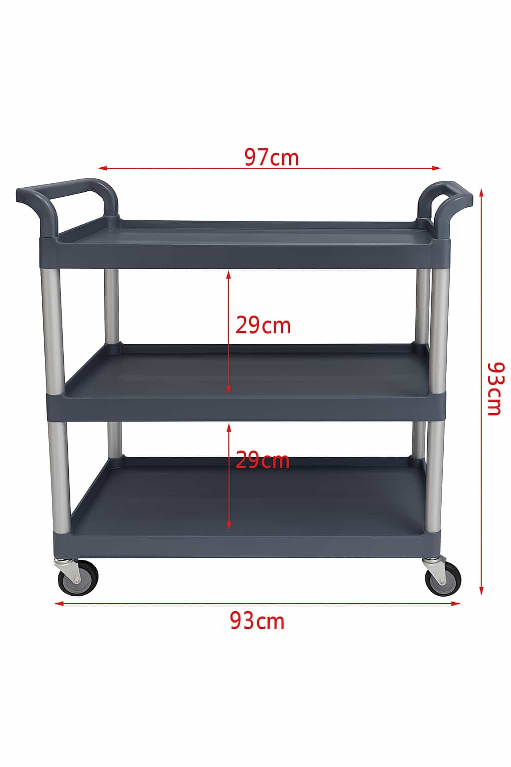 Carrito utilitario de tres niveles ideal para uso doméstico, comercial o industrial. Su estructura ofrece una combinación de resistencia y ligereza, con amplias bandejas que permiten transportar herramientas, utensilios o productos de limpieza con facilidad. Los mangos ergonómicos en ambos extremos brindan un control seguro, mientras que las ruedas giratorias de 360° facilitan el desplazamiento suave incluso en espacios reducidos. Su diseño funcional y sobrio en color gris lo hace adaptable a múltiples entornos, como oficinas, talleres, restaurantes o clínicas.