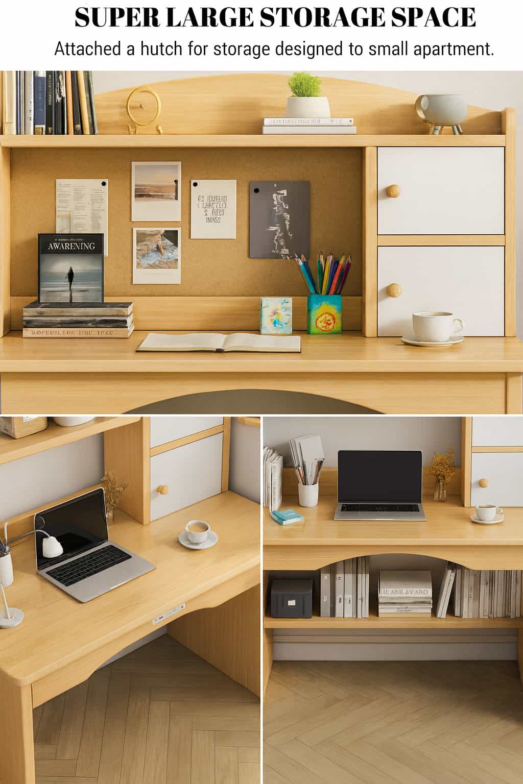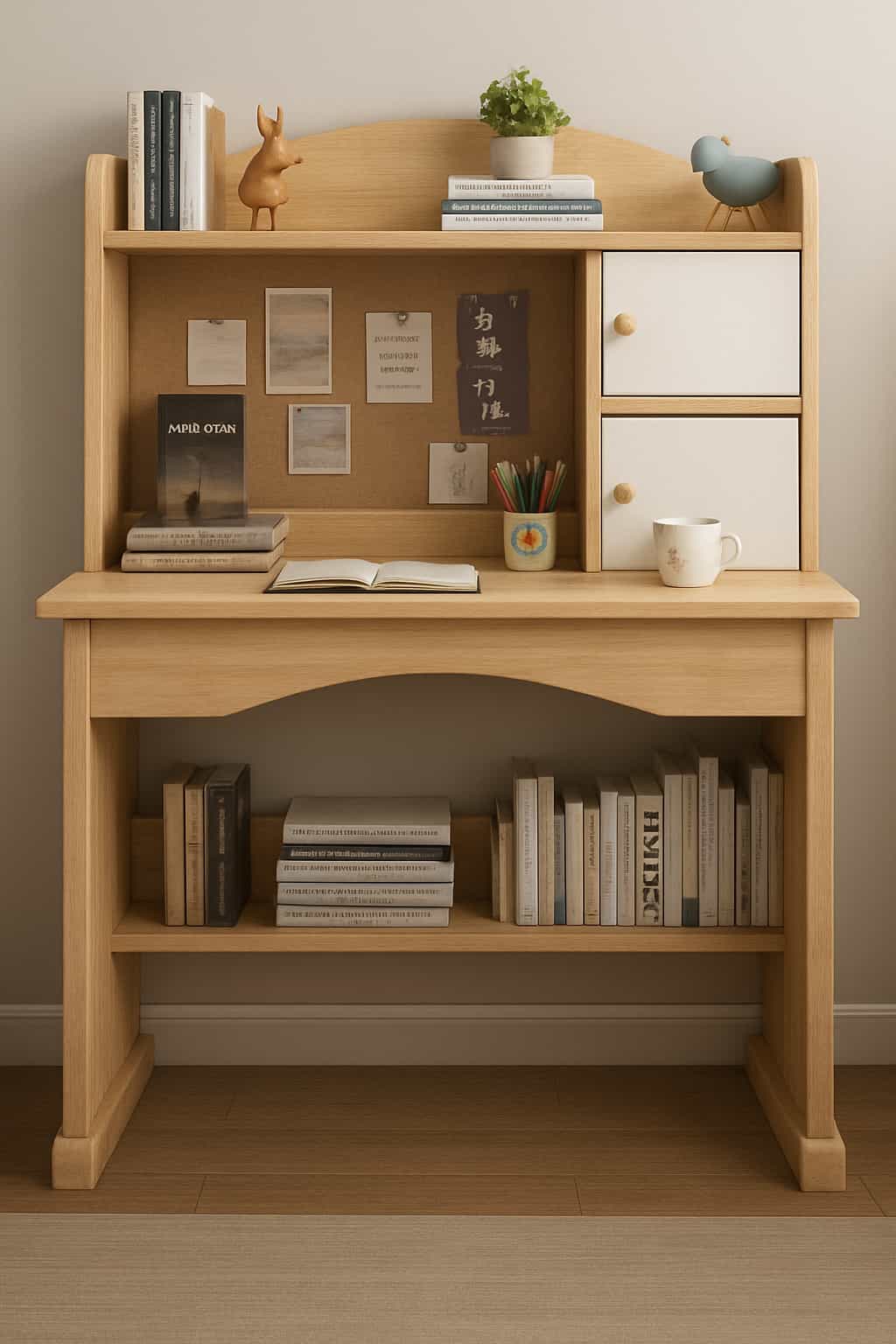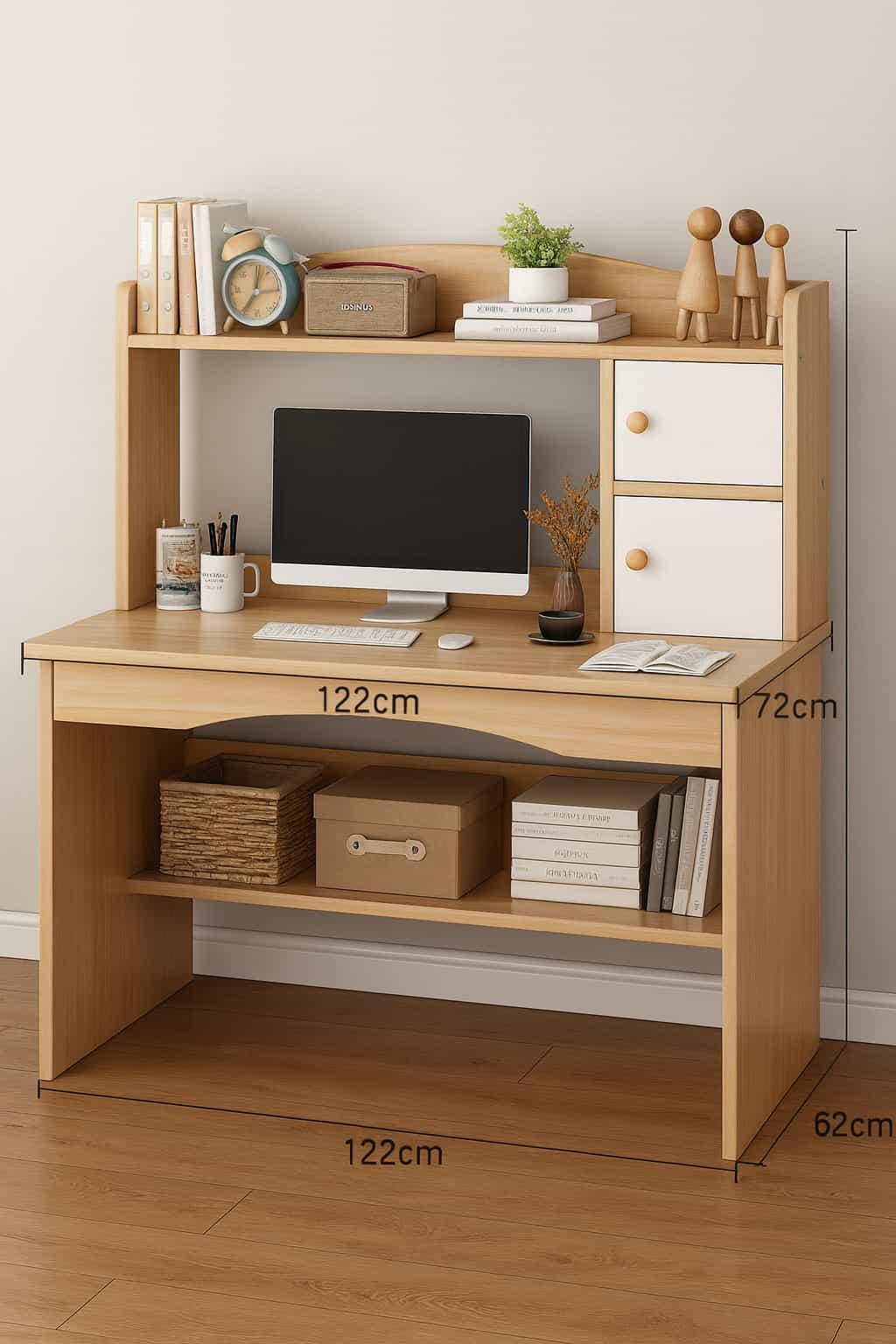 Escritorio con estantería superior en madera clara y blanco. Funcional, elegante y perfecto para estudio u oficina en casa.