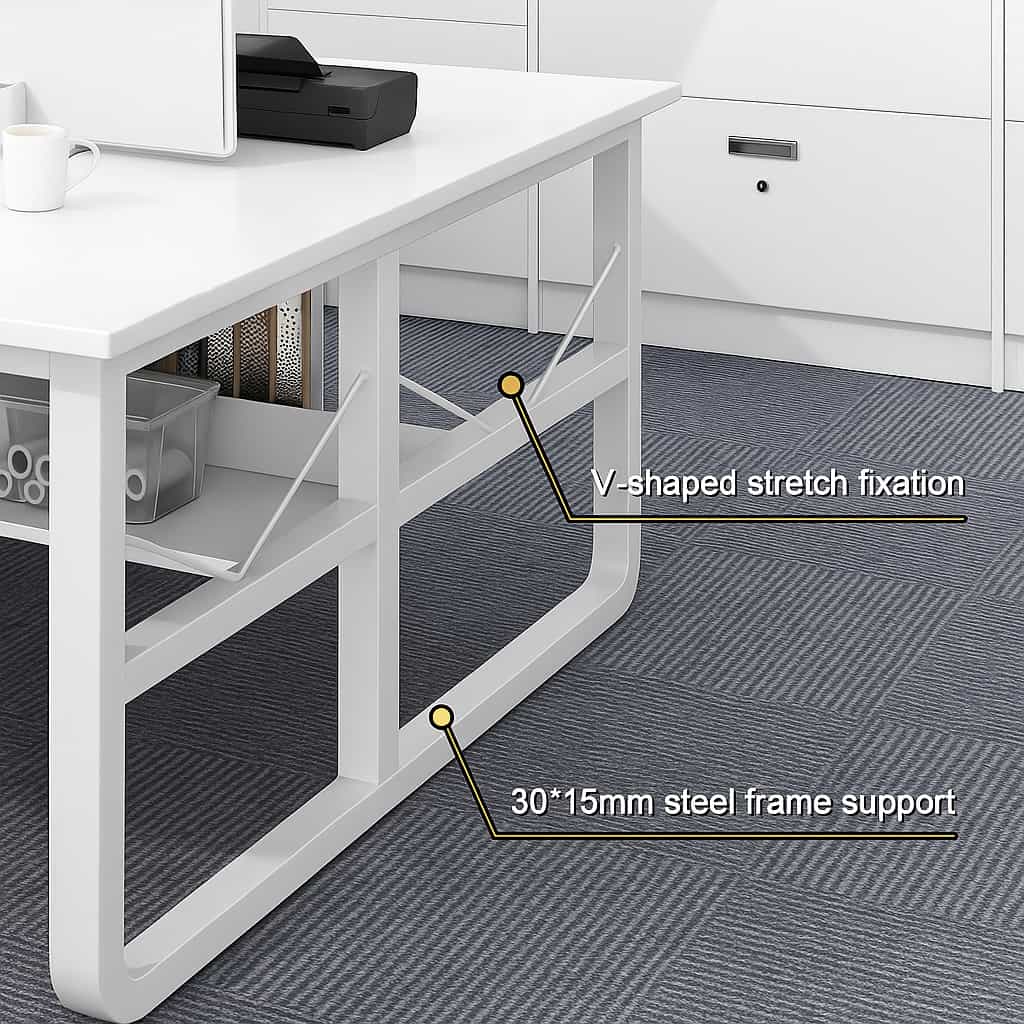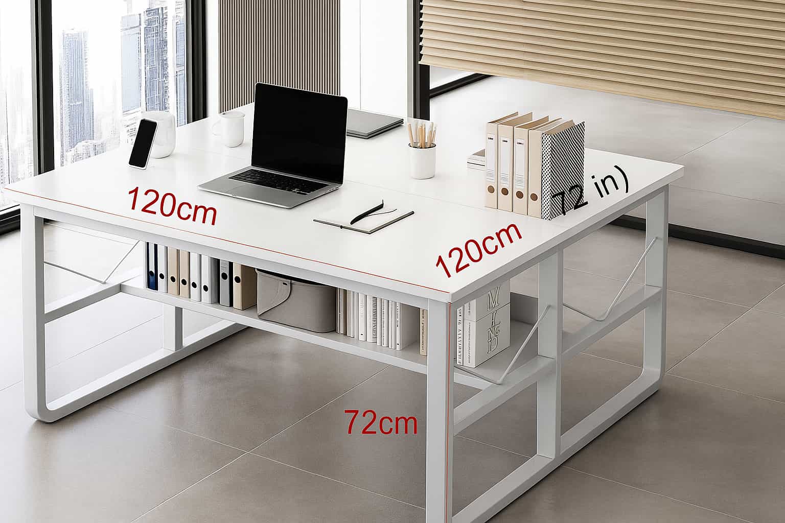 Escritorio doble de diseño moderno y funcional, ideal para oficinas, estudios o espacios de trabajo compartidos. Su estructura robusta en color blanco con base metálica ofrece estabilidad y una estética limpia y profesional. La superficie amplia permite organizar cómodamente computadoras, documentos y accesorios de oficina, mientras que los compartimientos inferiores brindan espacio adicional para almacenamiento.