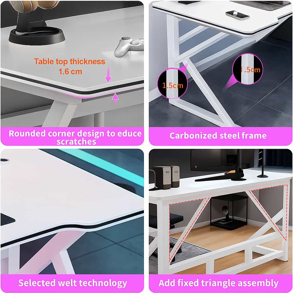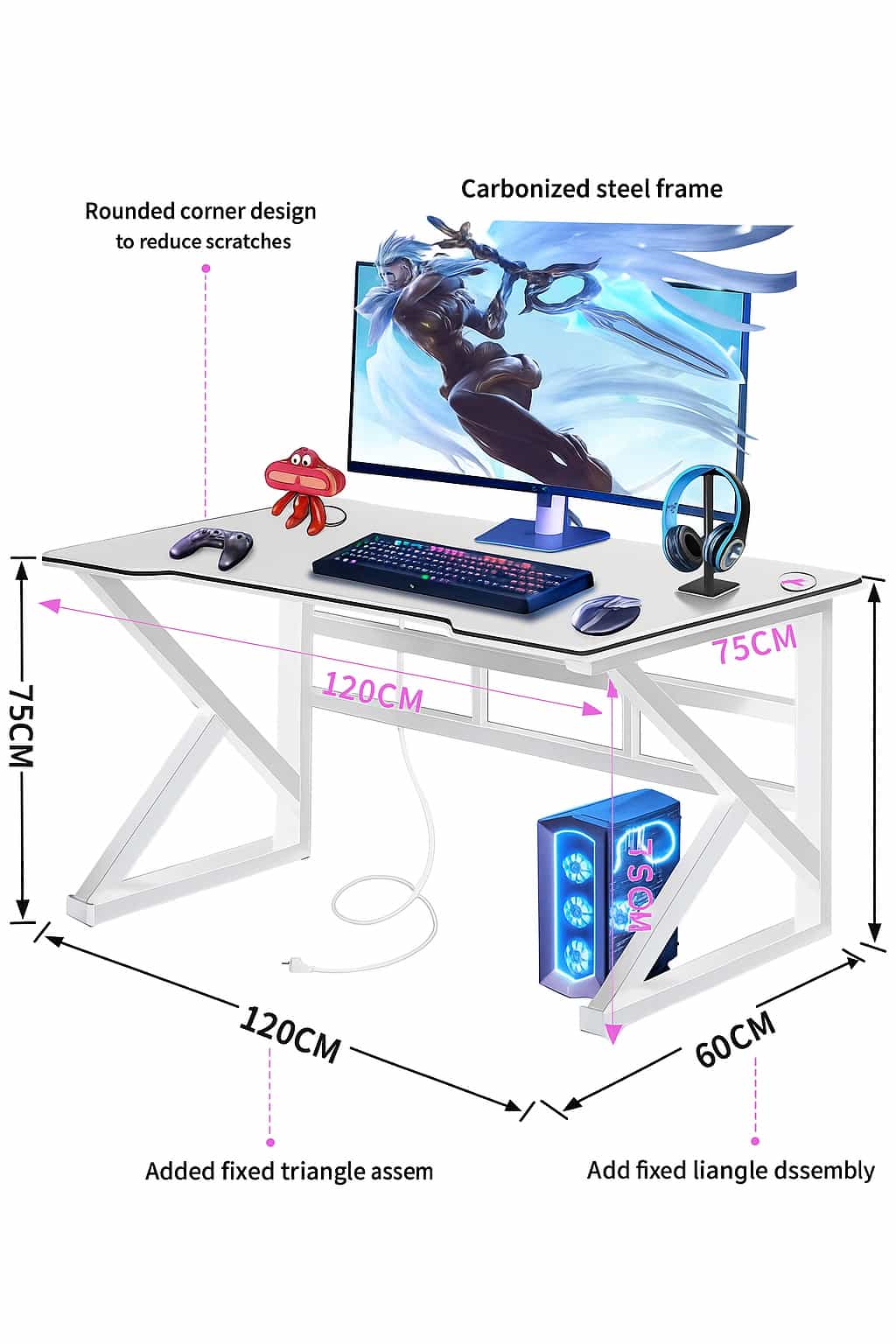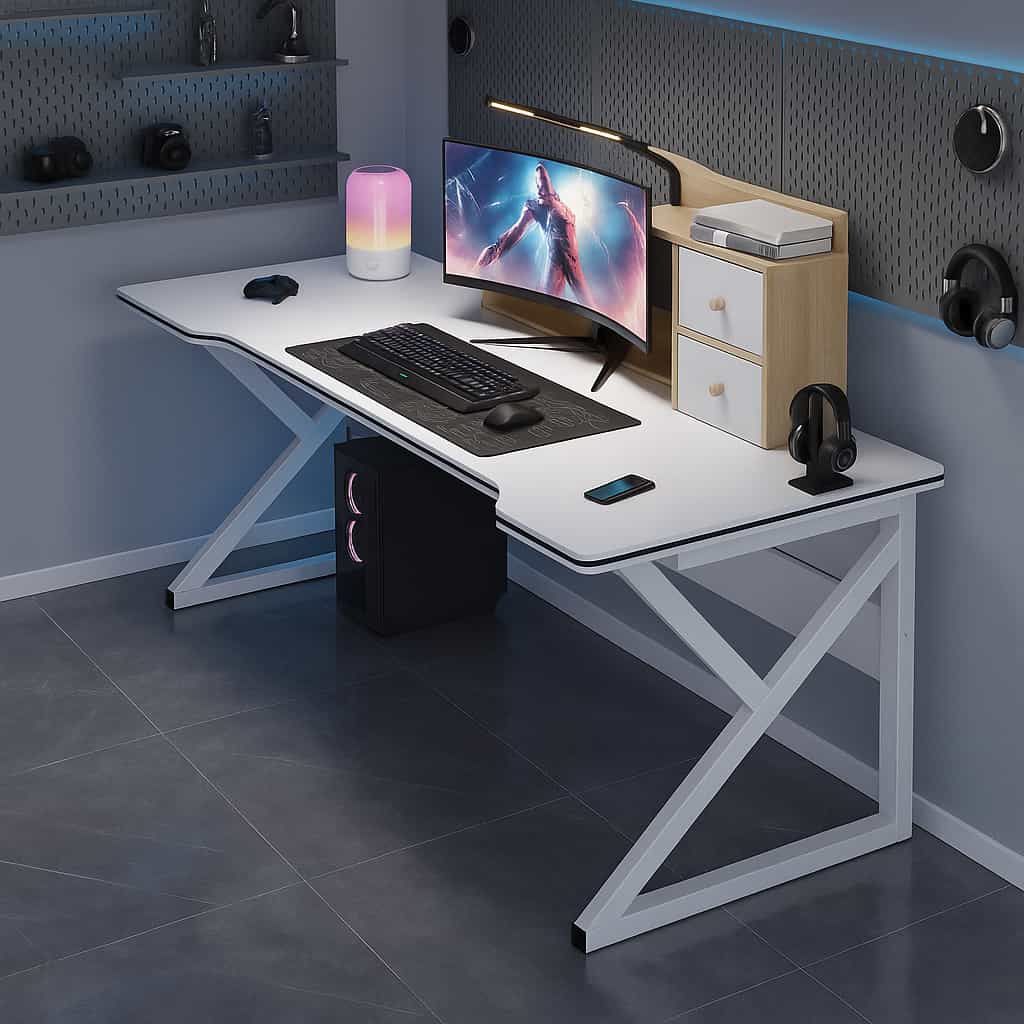 Escritorio gamer moderno diseñado para ofrecer comodidad y funcionalidad durante largas jornadas de trabajo o juego. Su superficie amplia permite organizar monitores, teclado, mouse y accesorios, mientras que su estructura metálica en forma de “X” garantiza máxima estabilidad. De estilo contemporáneo en color blanco, se adapta fácilmente a oficinas, estudios o habitaciones juveniles, aportando un toque tecnológico y ordenado.