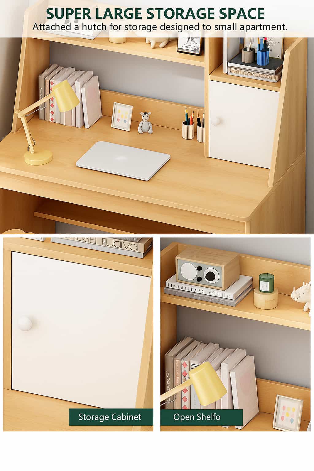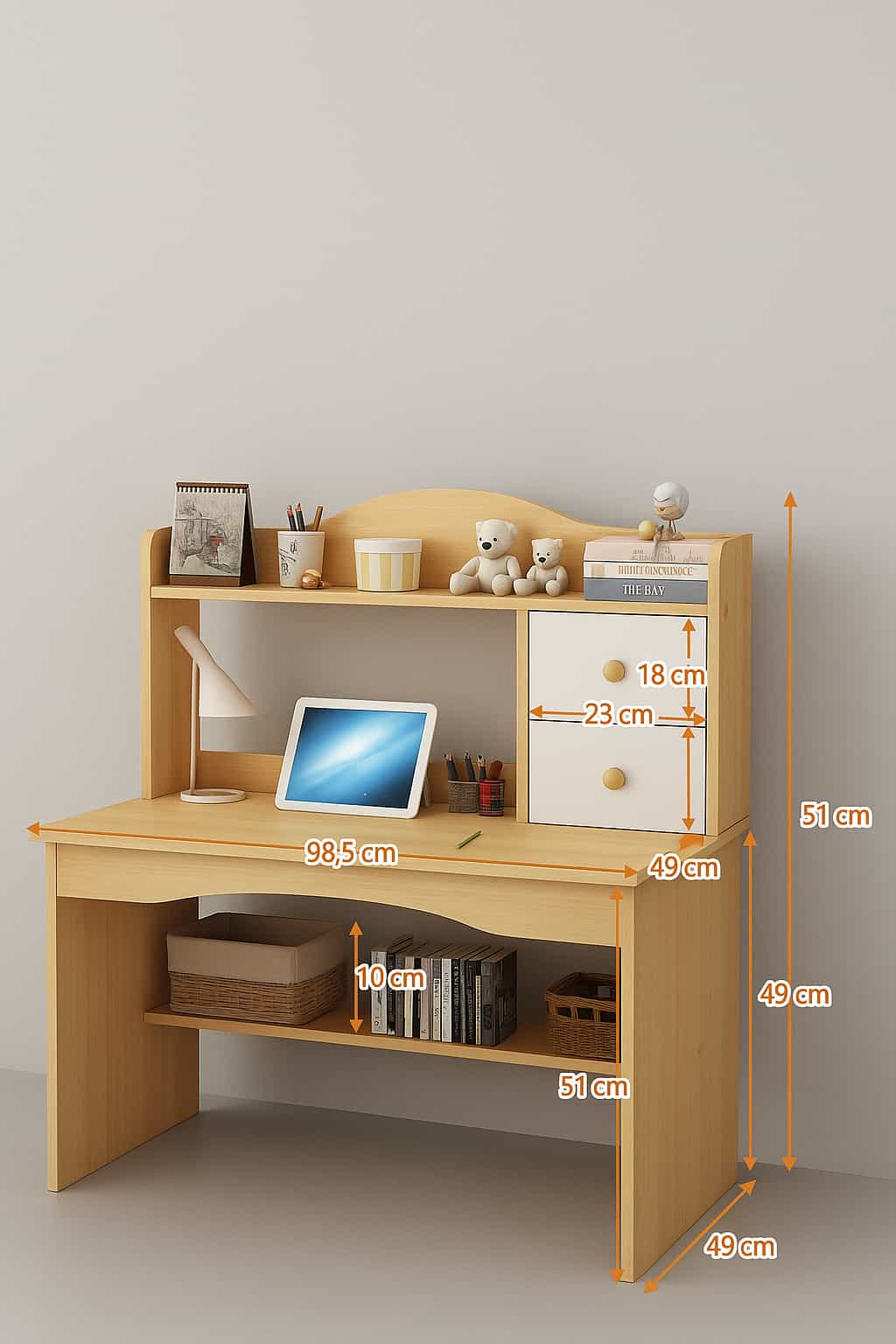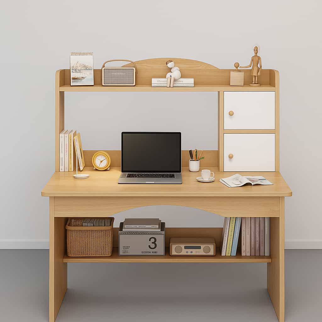 Escritorio multifuncional con estantería superior, diseñado para optimizar el espacio de estudio o trabajo en el hogar. Su estructura combina el tono natural de la madera con detalles en blanco, aportando calidez y modernidad. Incluye compartimentos abiertos y cerrados para mantener el área organizada, ideal para libros, útiles o elementos decorativos. Su diseño compacto lo hace perfecto para dormitorios o espacios reducidos.