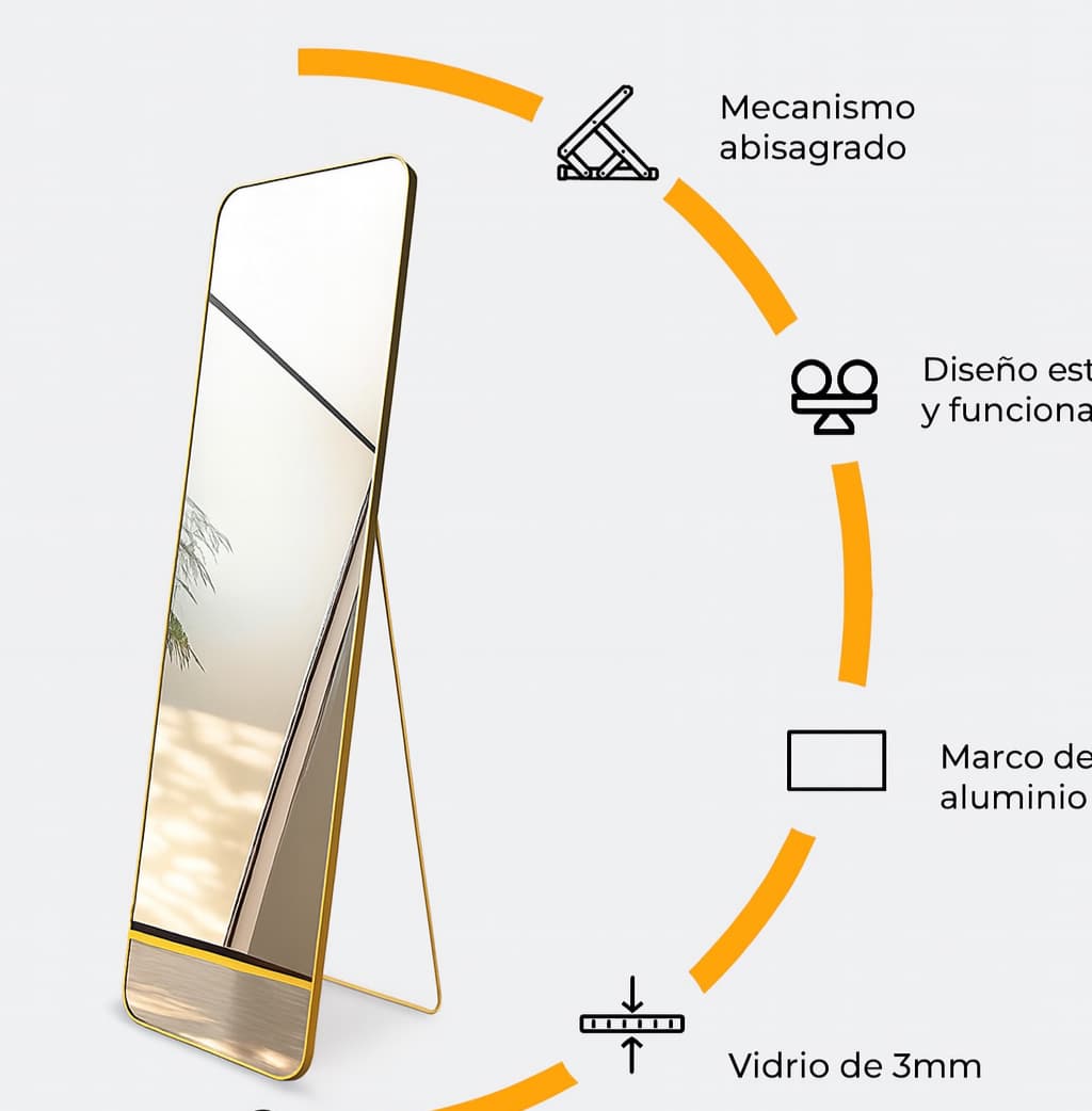 Espejo de cuerpo entero con diseño minimalista y bordes redondeados, ideal para dormitorios, vestidores o espacios comerciales. Su marco delgado en tono dorado aporta un toque de elegancia sin restar protagonismo a la superficie reflectante. De formato rectangular y proporciones estilizadas, este espejo permite una visión completa del cuerpo y genera sensación de amplitud en cualquier ambiente. Puede colocarse apoyado en el suelo o montado en la pared, adaptándose con facilidad a distintos estilos decorativos, desde el moderno hasta el clásico contemporáneo.