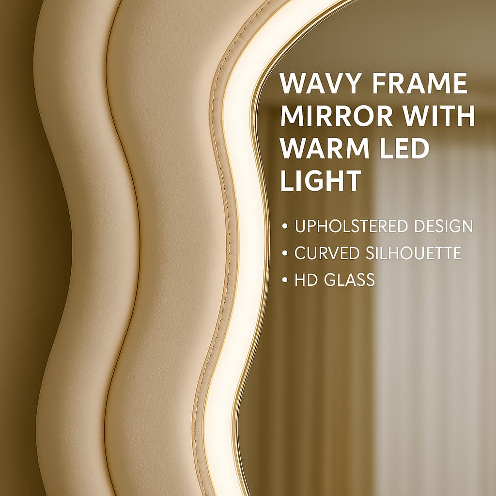 Espejo de cuerpo entero con diseño ondulado y marco acolchado, una pieza llamativa que combina arte y funcionalidad. Su estructura presenta un contorno irregular en tonos beige suaves, aportando un aire moderno, artístico y sofisticado al espacio. El borde interno cuenta con iluminación LED integrada, que realza su silueta curva y proporciona una luz uniforme ideal para maquillaje, vestidores o decoración. Este espejo se convierte en el centro de atención de cualquier habitación, fusionando estética contemporánea con un toque de diseño escultórico.