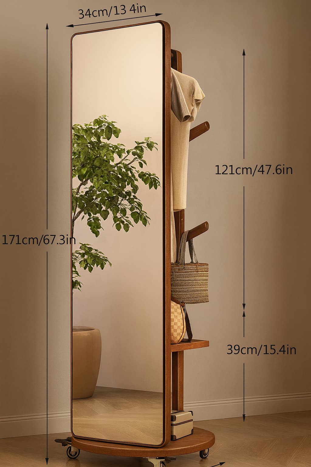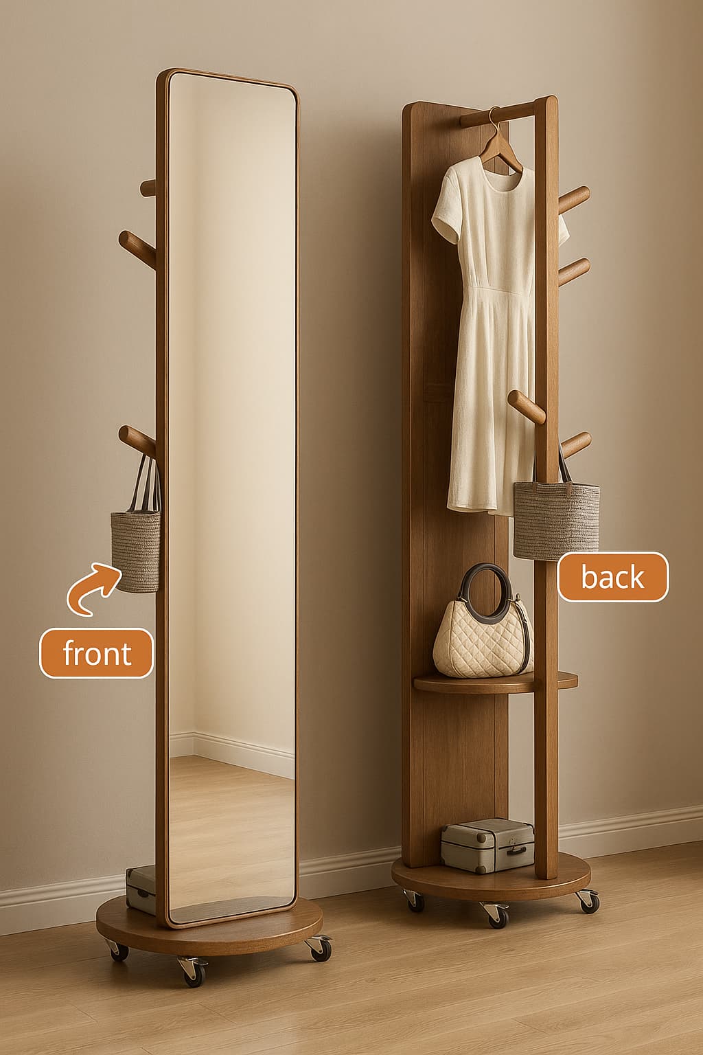 Espejo de cuerpo entero con estructura multifuncional giratoria, diseñado para maximizar el espacio y ofrecer practicidad sin perder elegancia. Su diseño rectangular con marco en tono madera cálida lo convierte en una pieza ideal para dormitorios, vestidores o tiendas. El espejo gira 360°, revelando en su parte posterior una estructura con percheros, repisas y compartimentos para organizar ropa, accesorios o bolsos. Esta combinación de espejo y almacenaje lo hace perfecto para espacios modernos y funcionales, aportando estilo y utilidad en un solo mueble.