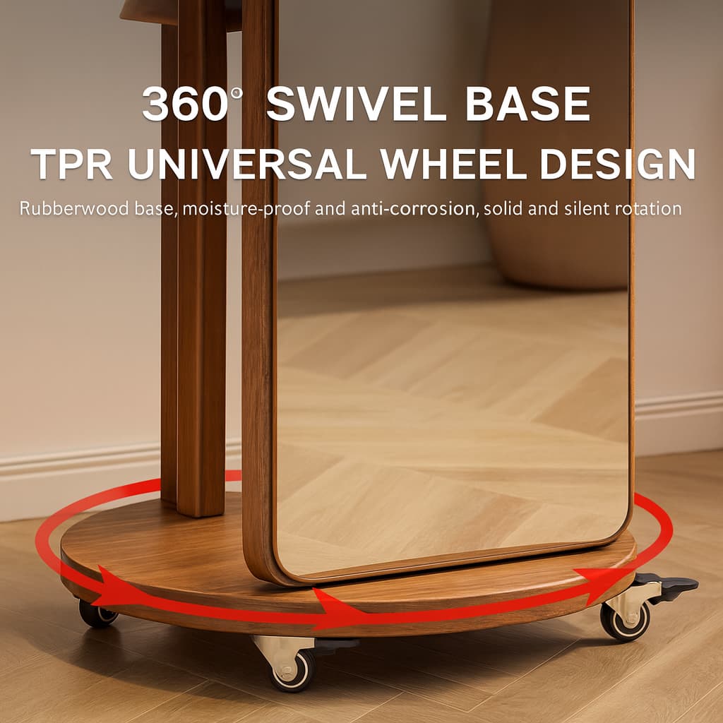 Espejo giratorio 360° con estructura de almacenamiento en madera natural. Funcional y elegante, ideal para dormitorios o tiendas modernas.