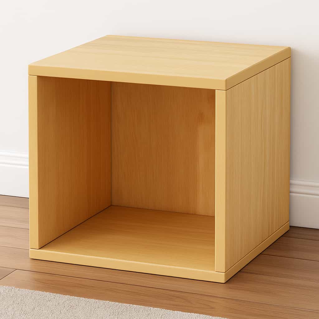 Módulo cúbico abierto de madera natural, funcional y versátil, ideal como mesa auxiliar o estante decorativo.