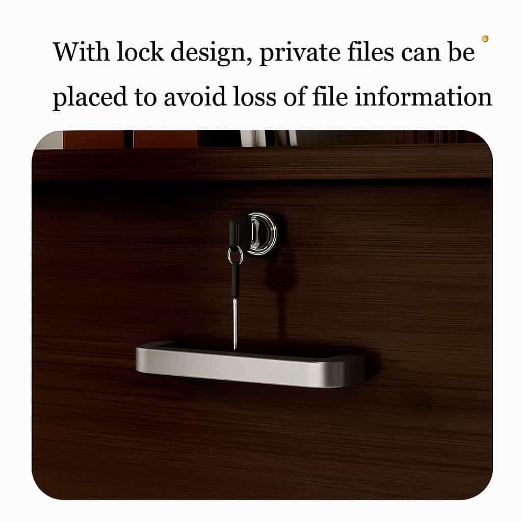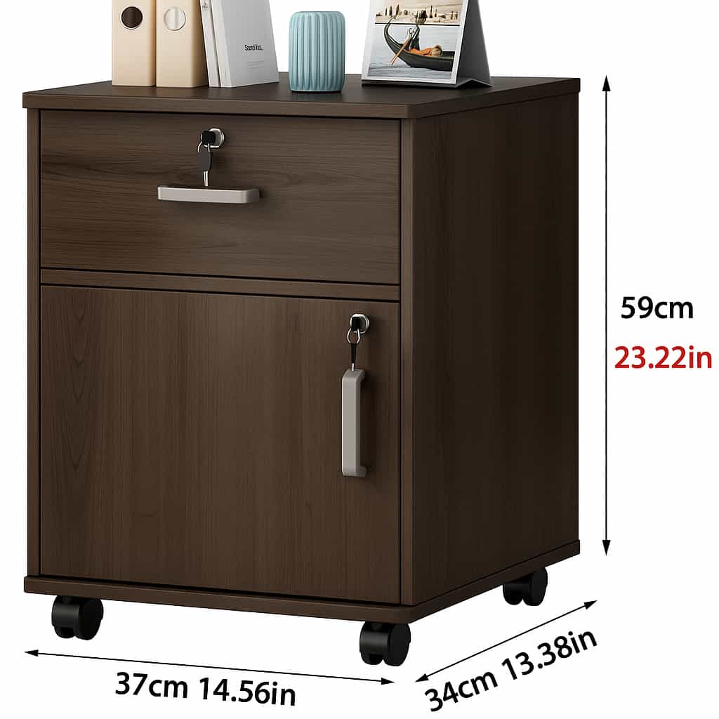 Archivador móvil en madera oscura con cajón con llave y compartimento inferior, práctico y elegante para oficina o estudio.