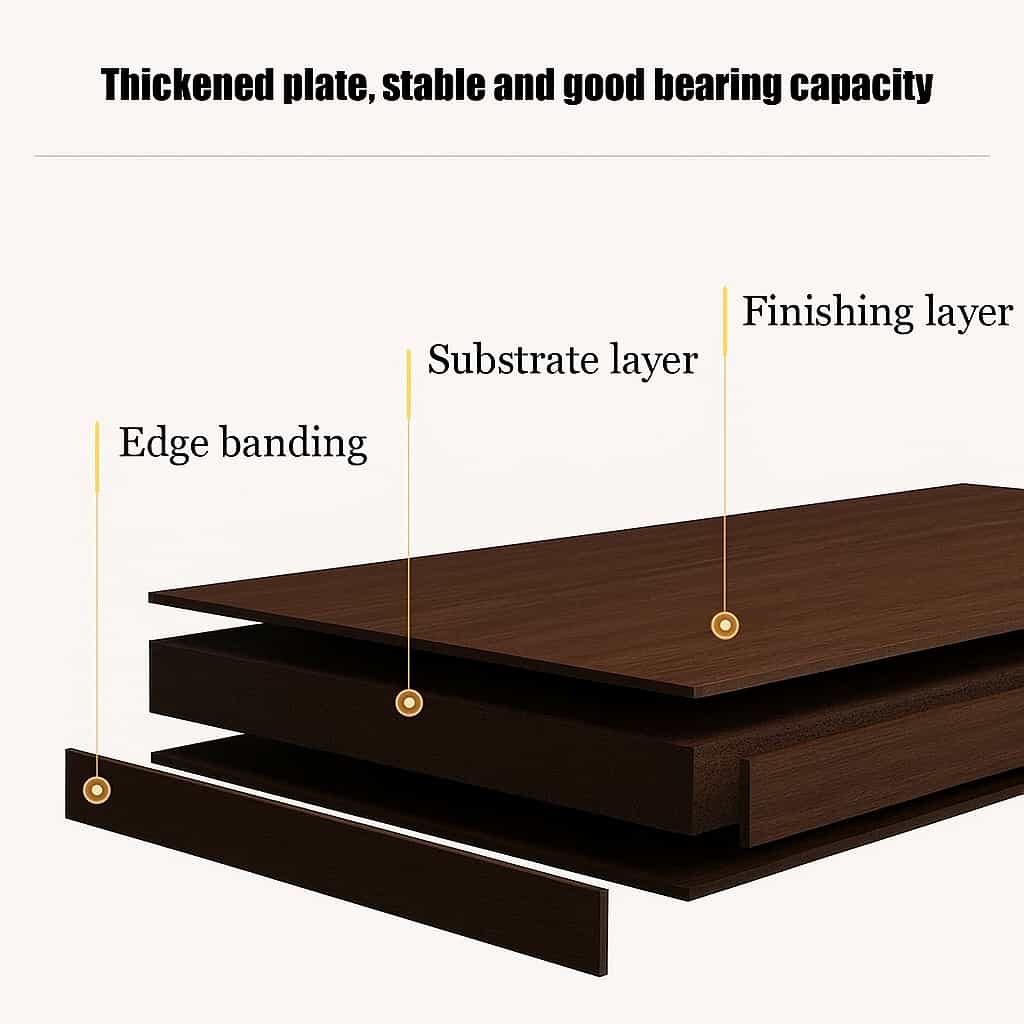 Fabricado en MDF de alta resistencia con acabado laminado color nogal oscuro, resistente al uso diario y fácil de limpiar.