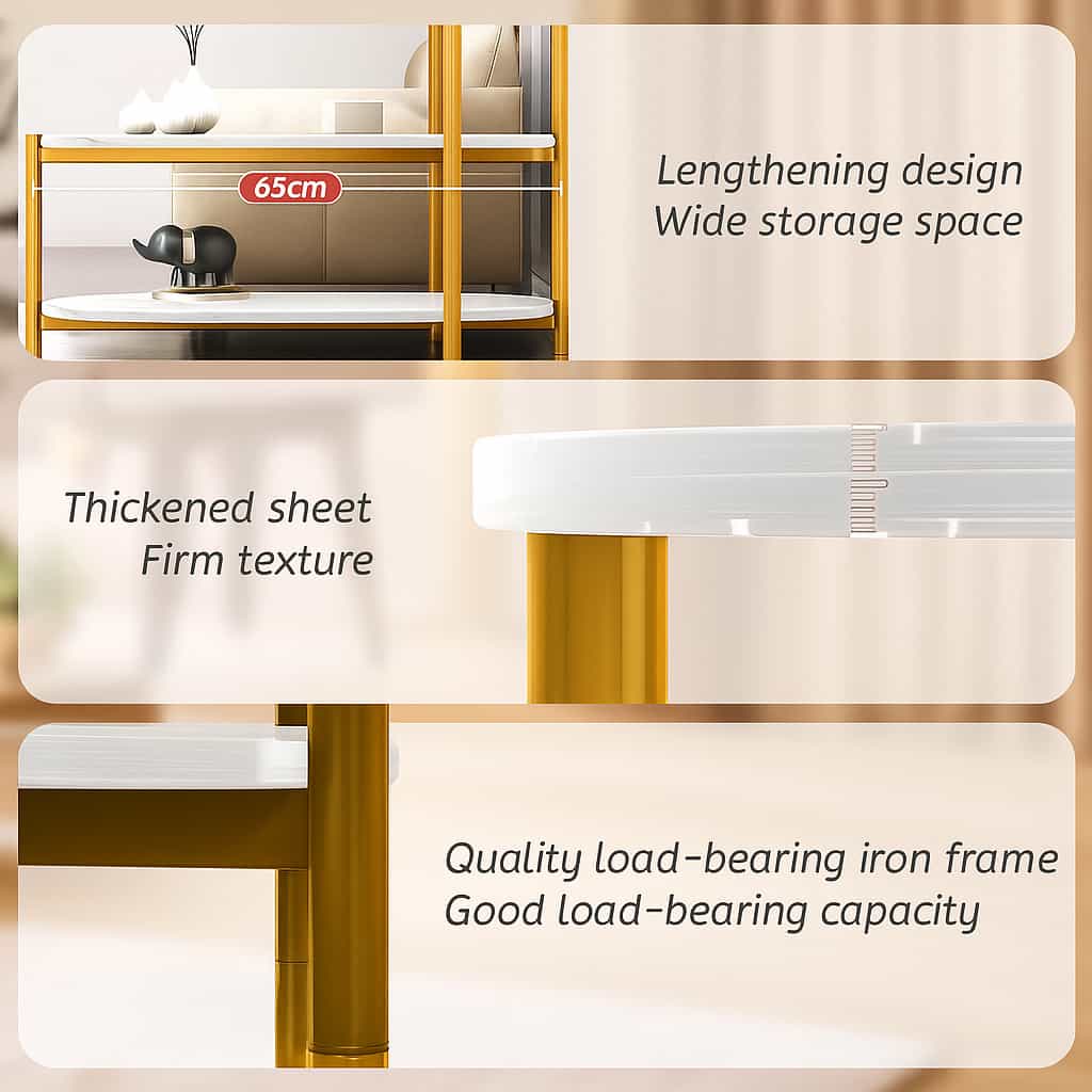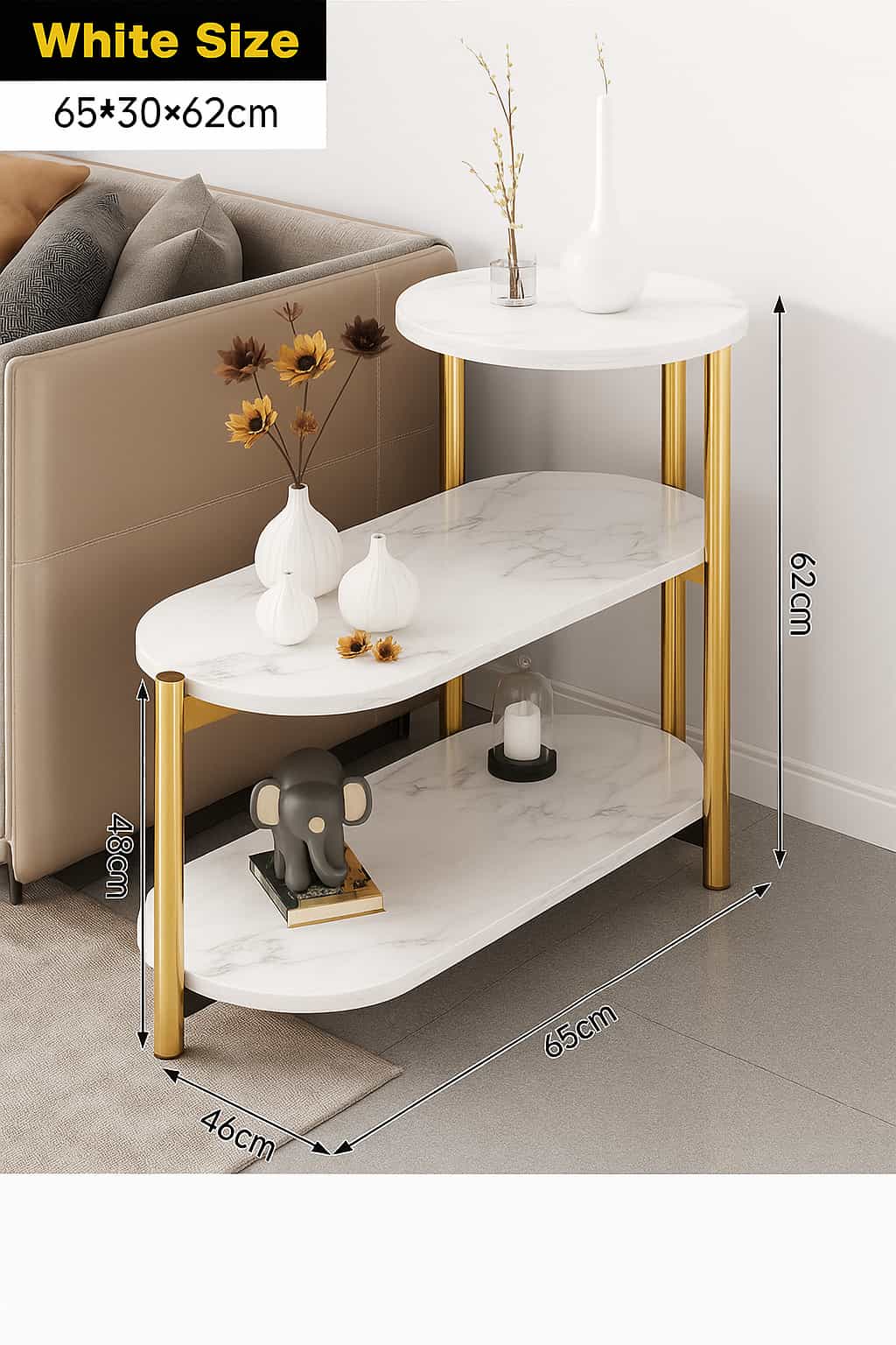 Mesa auxiliar de tres niveles con diseño moderno y sofisticado. Su estructura dorada contrasta con las superficies de efecto mármol blanco, creando una pieza elegante ideal para salas, dormitorios o recibidores. Su forma ovalada y los bordes suaves aportan ligereza visual, mientras que los tres niveles permiten organizar y exhibir objetos decorativos con estilo.