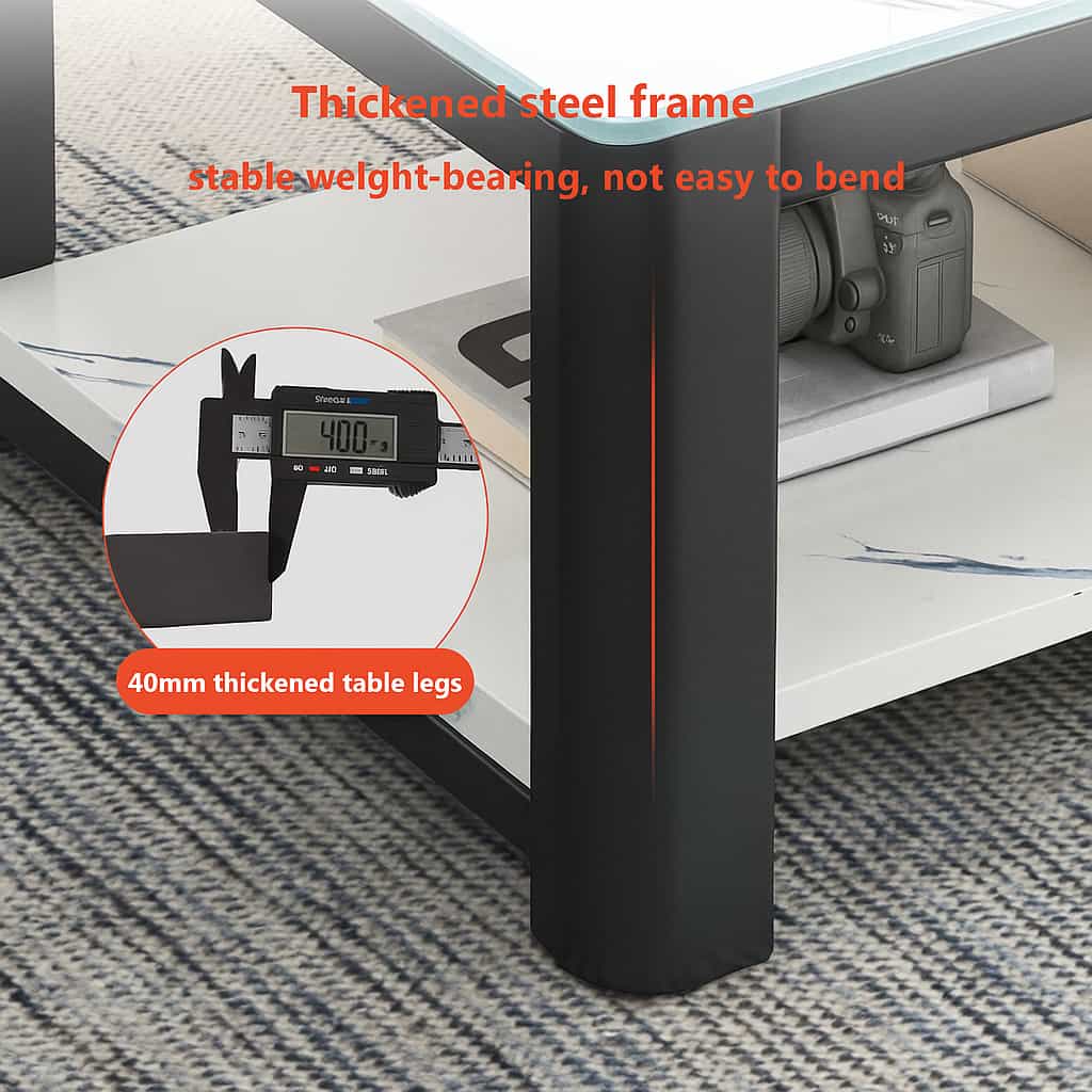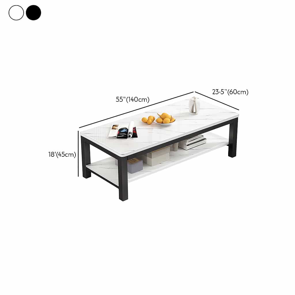 Mesa de centro rectangular de estilo contemporáneo con un diseño funcional y elegante. Su cubierta en acabado estilo mármol blanco aporta luminosidad y sofisticación al espacio, mientras que la base metálica negra brinda un contraste moderno y gran estabilidad. Incluye una repisa inferior que permite mantener el área ordenada, ideal para almacenar libros, revistas o elementos decorativos. Perfecta para salas modernas que buscan combinar estética y practicidad.