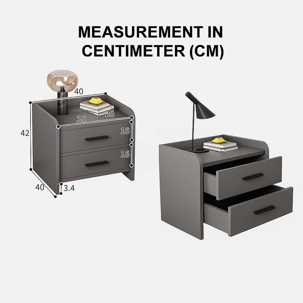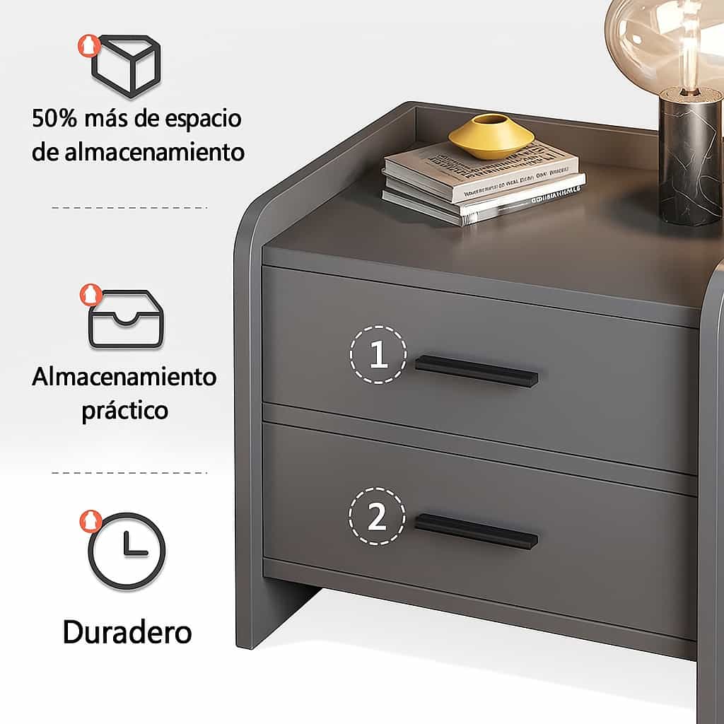 Buró moderno de dos cajones en color gris oscuro, con diseño minimalista y bordes redondeados que aportan suavidad visual y seguridad. Su estilo elegante y contemporáneo lo convierte en una pieza ideal para dormitorios modernos o ambientes sobrios. Ofrece funcionalidad y organización, con una superficie superior perfecta para colocar lámparas, libros o artículos decorativos.