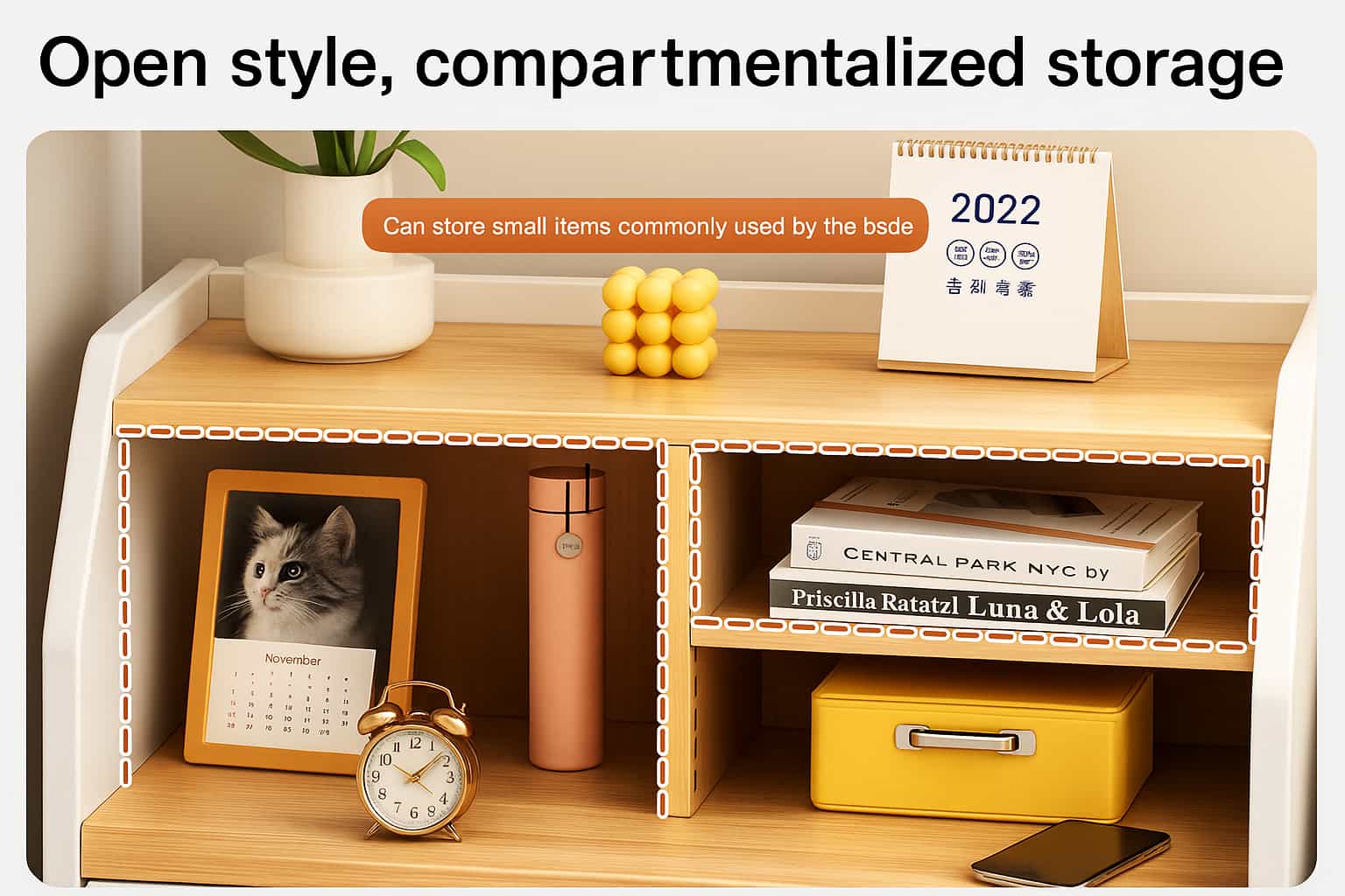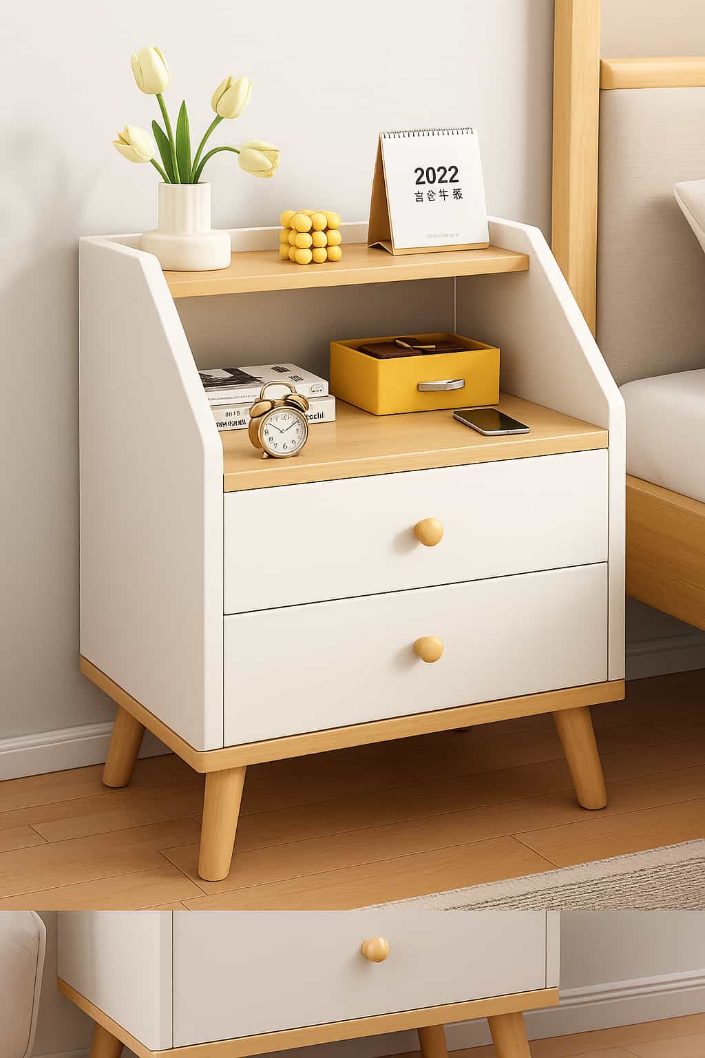 Mesa auxiliar de estilo escandinavo con líneas suaves y diseño funcional, ideal para dormitorios o espacios modernos. Combina una estructura blanca con detalles en tono madera natural, aportando calidez y elegancia. Sus compartimentos permiten mantener el orden sin perder estilo.
