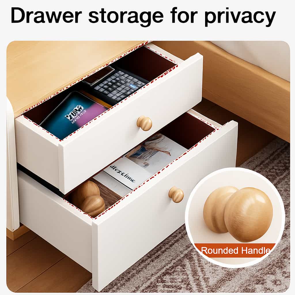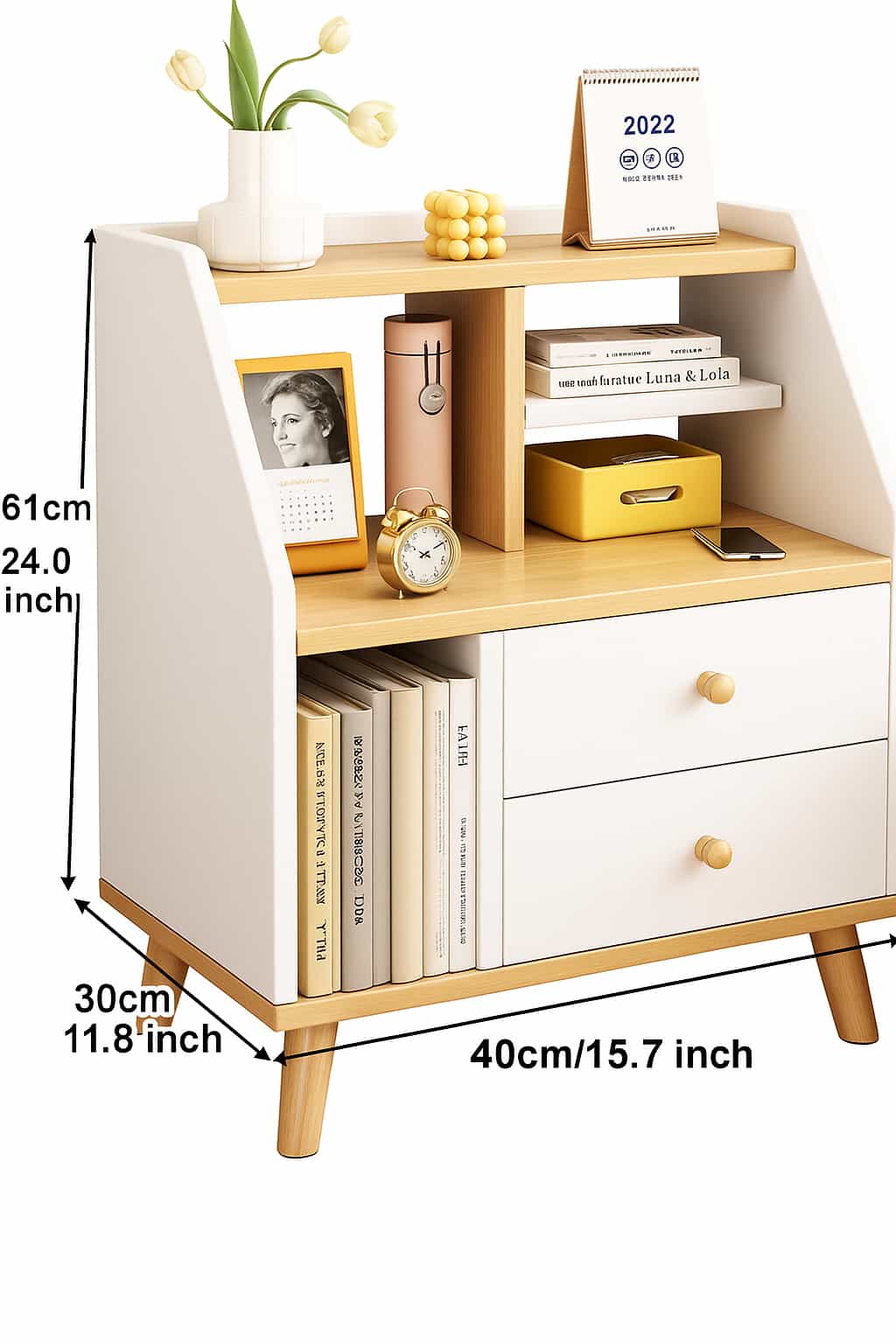 Mesa auxiliar escandinava blanca y madera con dos cajones y compartimiento abierto, elegante y funcional.