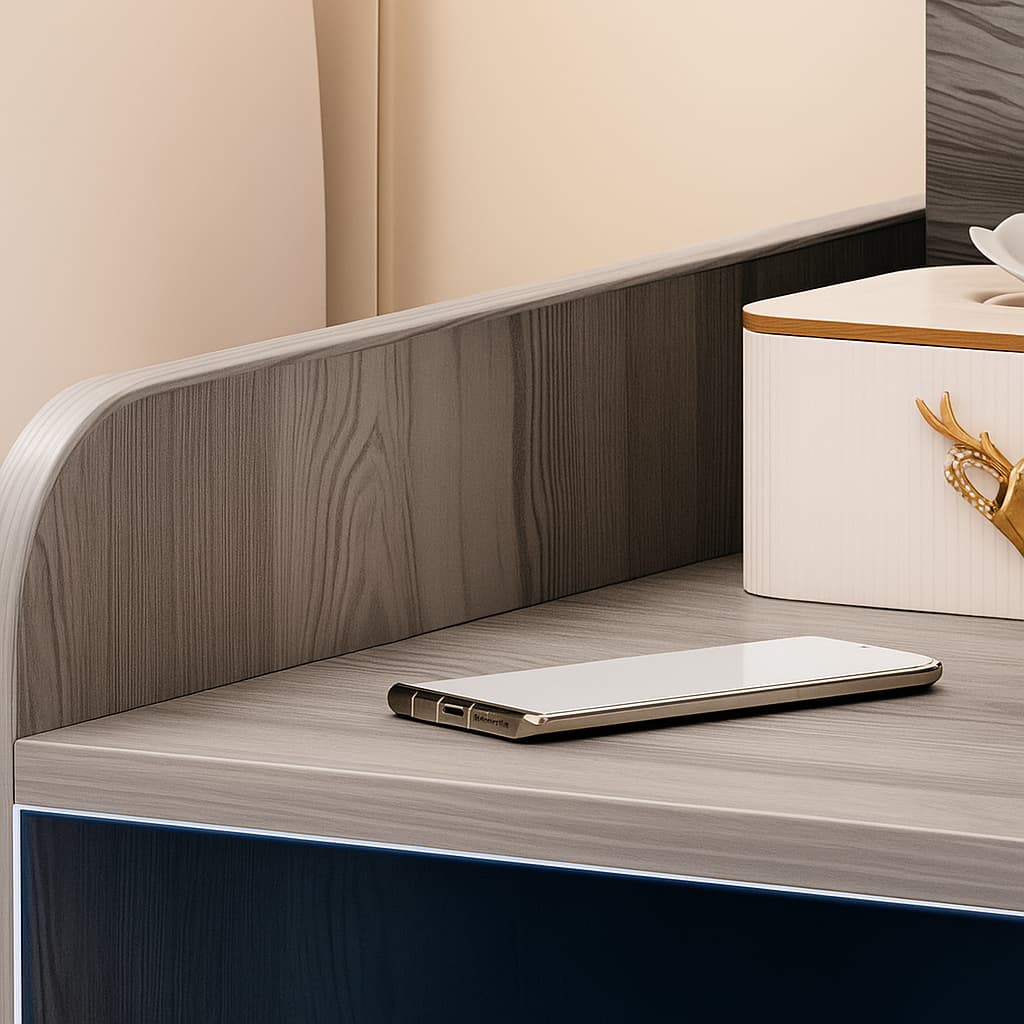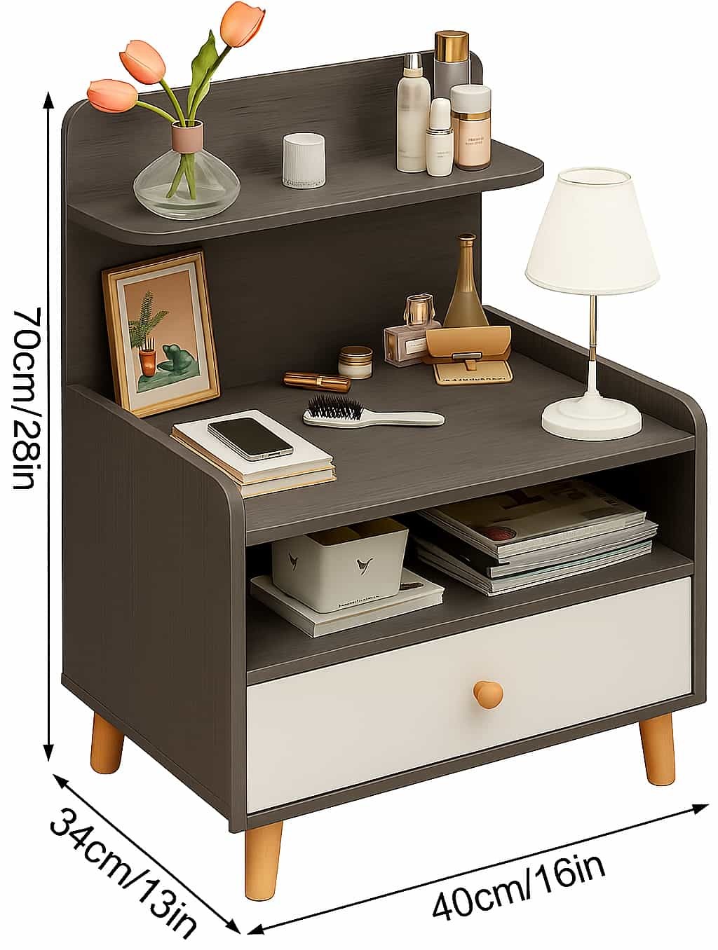 Mesa de noche gris y blanca con repisas y cajón inferior, ideal para mantener orden y estilo en el dormitorio.