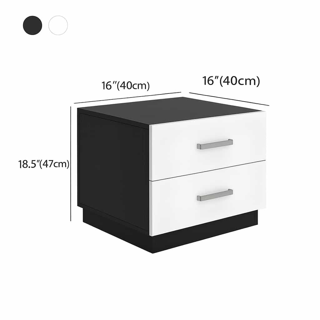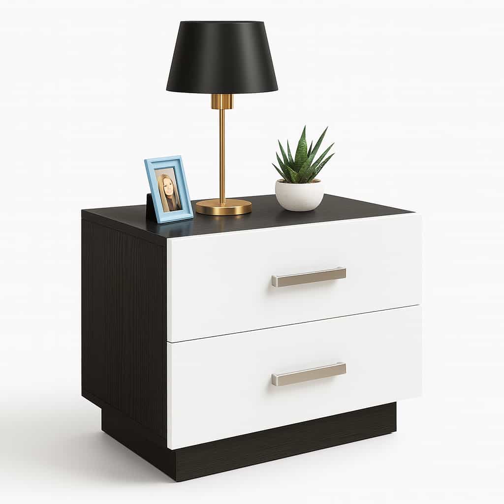 Mesa de noche moderna bicolor negro y blanco con dos cajones. Compacta, elegante y práctica para dormitorio o sala.