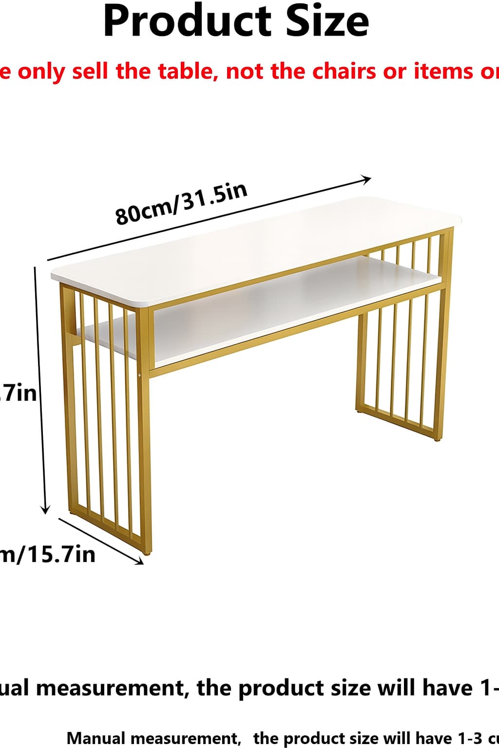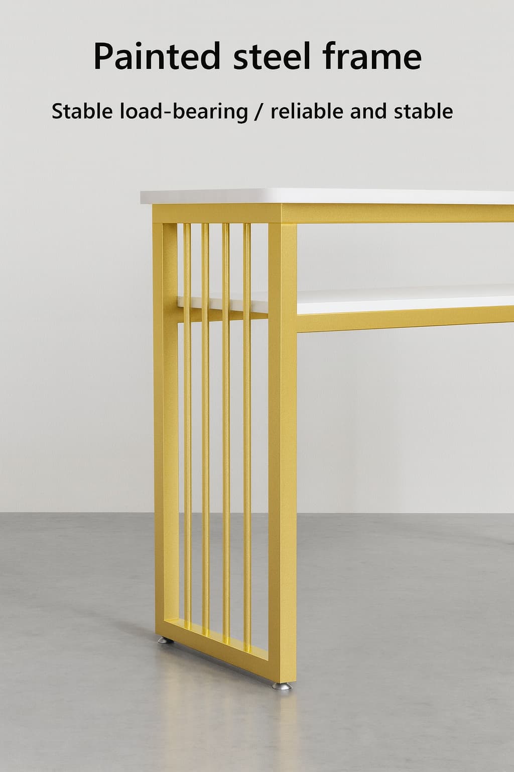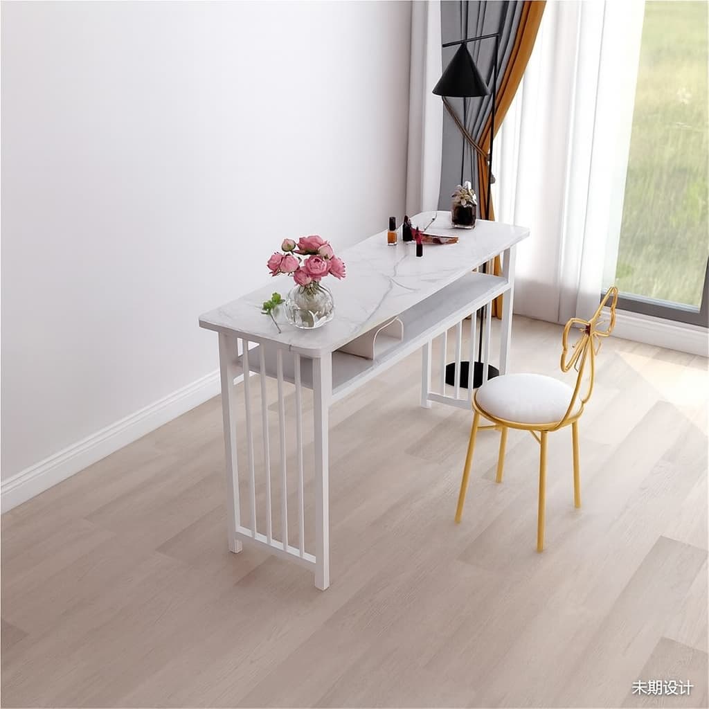 Mesa de manicurista, tocador o escritorio moderno con estructura dorada y superficie tipo mármol blanco. Diseño elegante con cajón central, ideal para dormitorios u oficinas con estilo glamuroso.