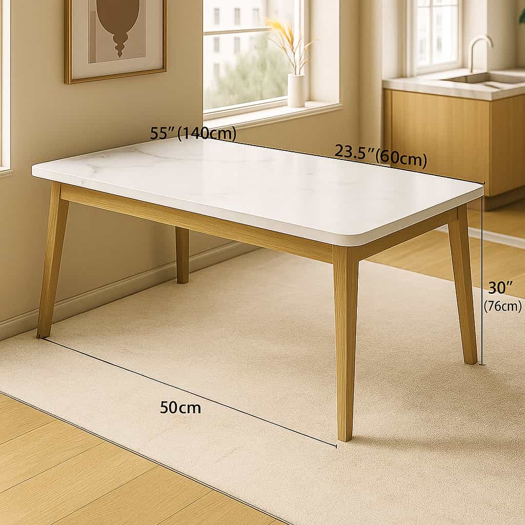 Mesa rectangular de diseño escandinavo con una elegante superficie de efecto mármol blanco y patas de madera natural. Su estilo minimalista y funcional combina a la perfección con comedores modernos, salas o espacios de trabajo. La estructura robusta garantiza estabilidad, mientras que el acabado en tonos claros aporta luminosidad y amplitud visual al ambiente.