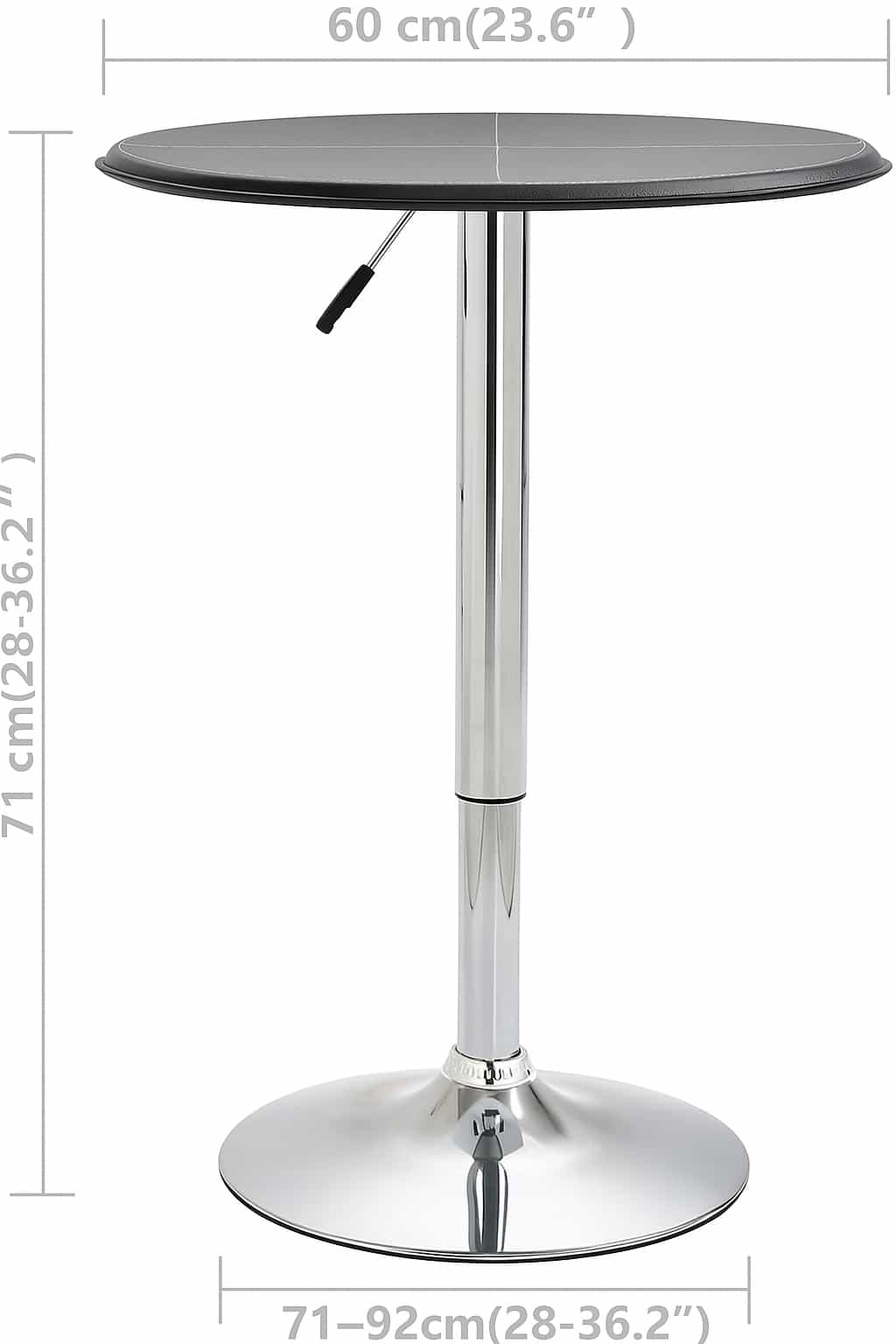 Mesa alta de diseño moderno con base metálica cromada y tablero circular negro. Su estructura elegante y funcional la hace ideal para bares, cafeterías, cocinas o espacios de entretenimiento. Cuenta con un sistema de ajuste de altura mediante palanca lateral, ofreciendo versatilidad para distintos usos. Su acabado minimalista combina a la perfección con diferentes estilos decorativos, aportando un toque contemporáneo y sofisticado.
