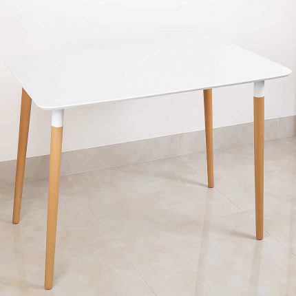 Tablero de MDF con recubrimiento melamínico, base y columna de acero cromado con elevador hidráulico.