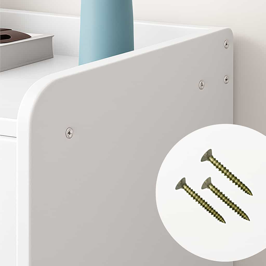 Fabricada en MDF de alta densidad con acabado lacado blanco cálido, resistente a la humedad y fácil de limpiar.