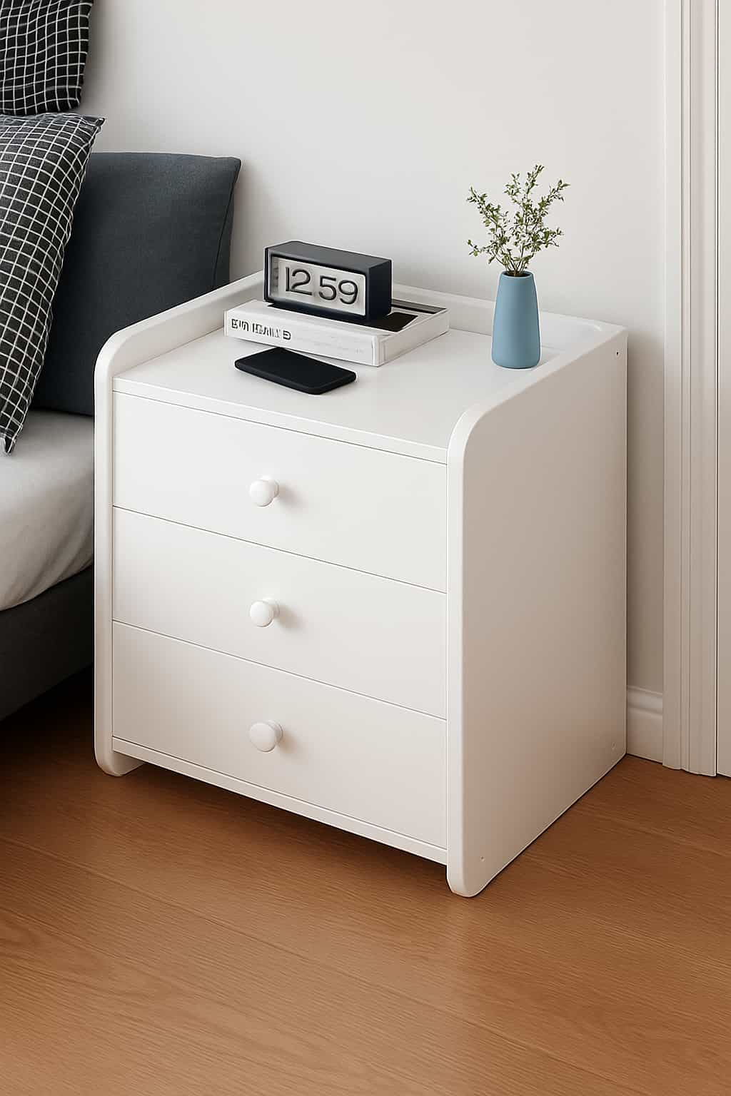 Mesa de noche moderna en color blanco cálido, con un diseño limpio y bordes redondeados que aportan suavidad y elegancia al dormitorio. Su estilo minimalista permite combinarla fácilmente con diferentes tipos de mobiliario, brindando orden y funcionalidad.