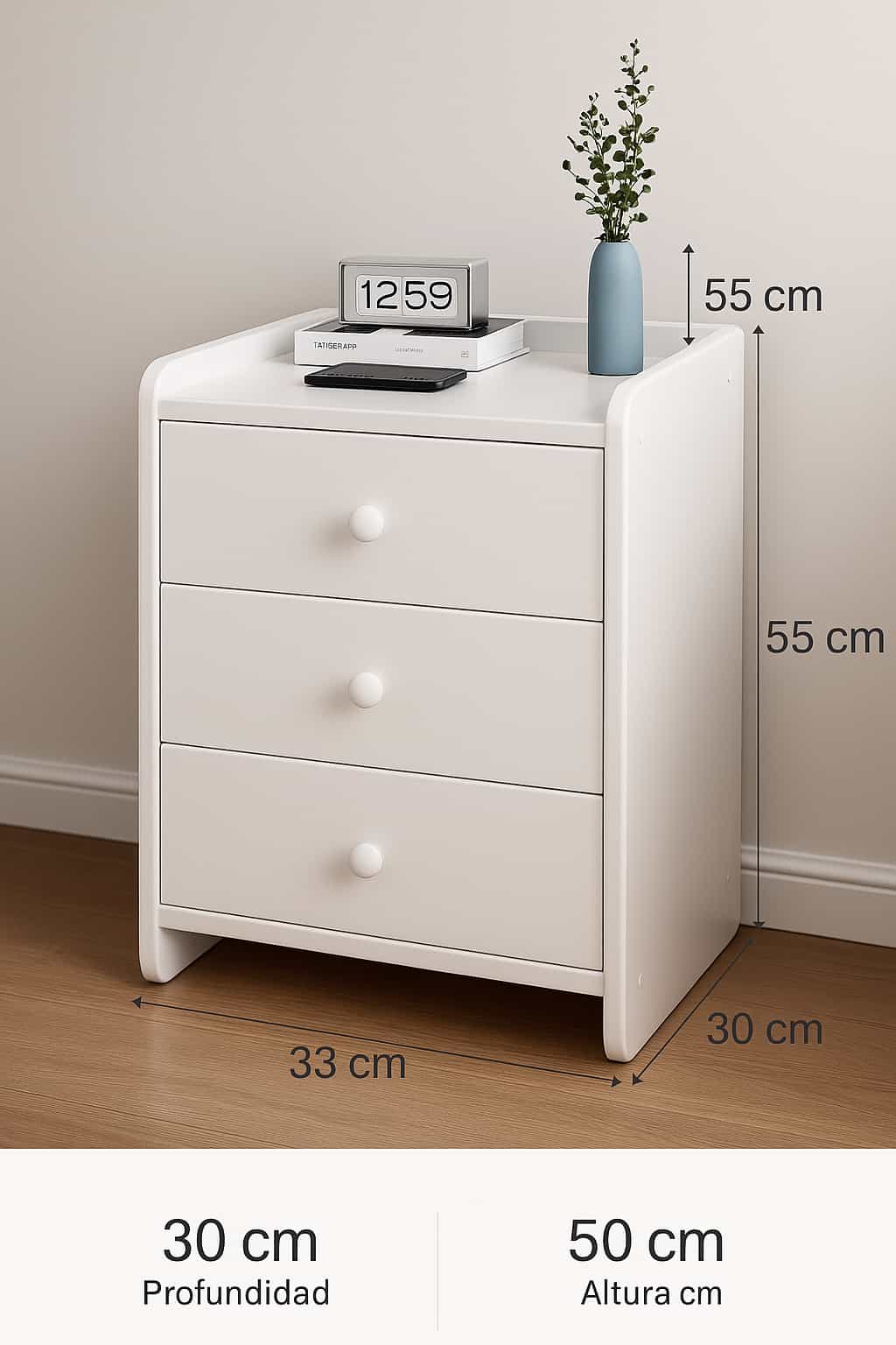 - Superficie superior práctica para colocar lámparas, relojes o decoración.
