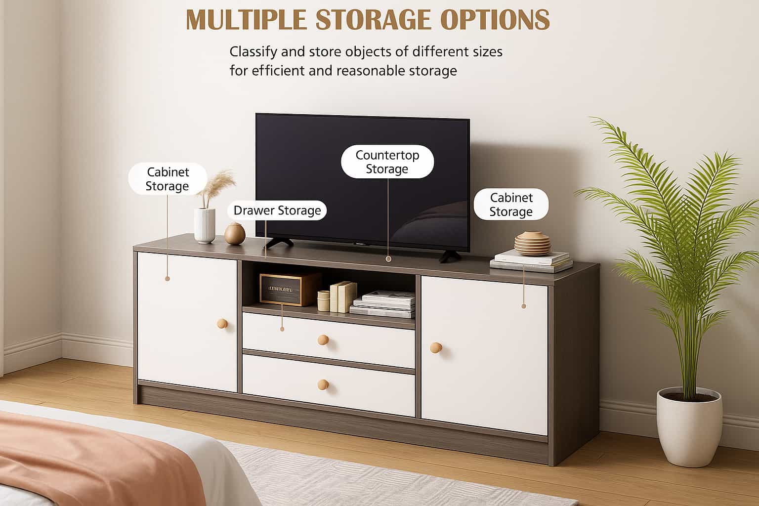 Mueble para TV moderno en gris y blanco brillante, con amplio almacenamiento y diseño elegante para salas contemporáneas.