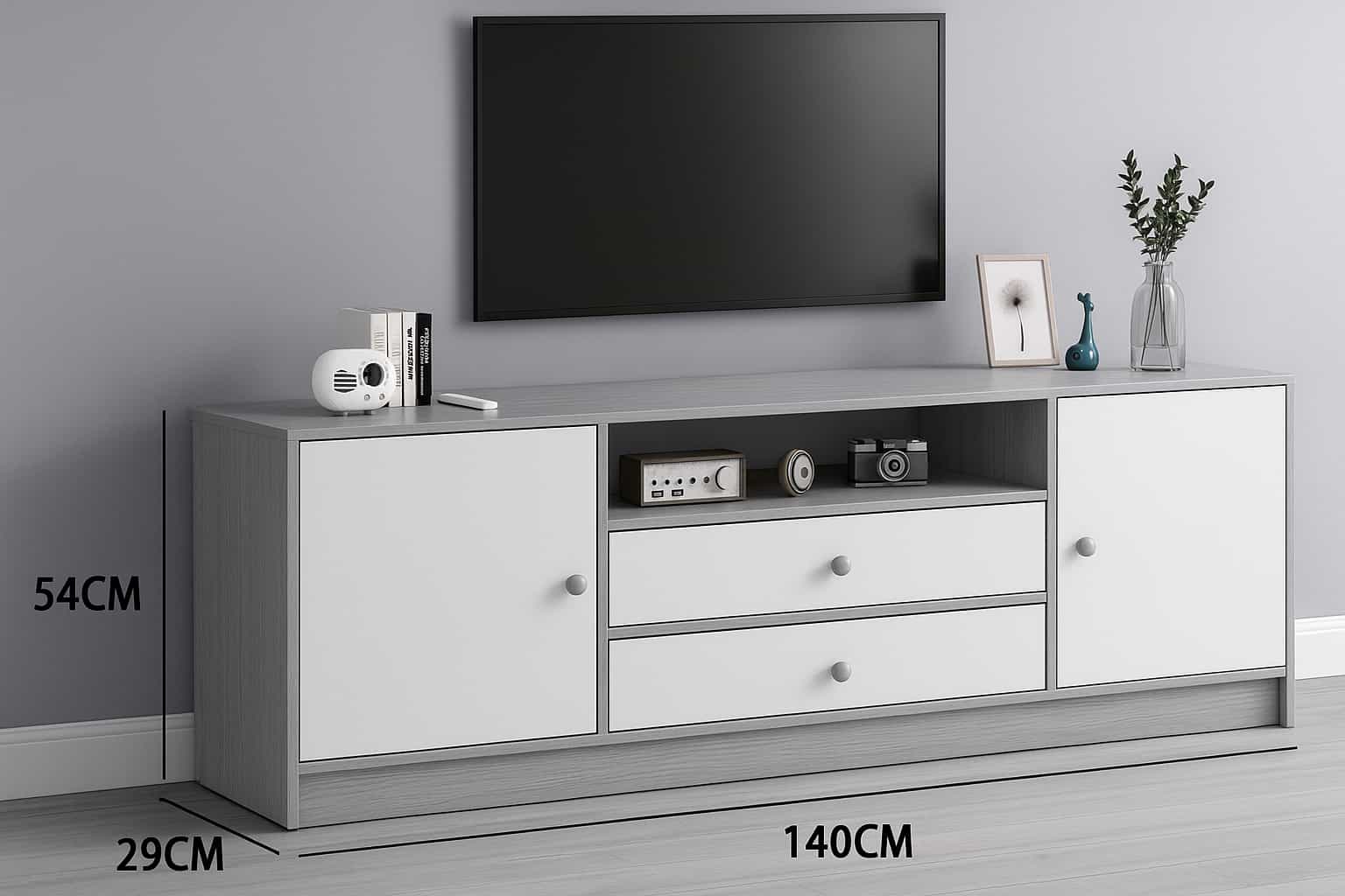 Mueble para TV de diseño moderno y funcional, ideal para salas contemporáneas. Combina un acabado en gris madera con puertas y cajones en blanco brillante, logrando un contraste elegante y limpio. Su estructura robusta ofrece espacio suficiente para equipos electrónicos, decoración y almacenamiento. Incluye dos puertas laterales, dos cajones centrales y un compartimiento abierto para dispositivos multimedia.
