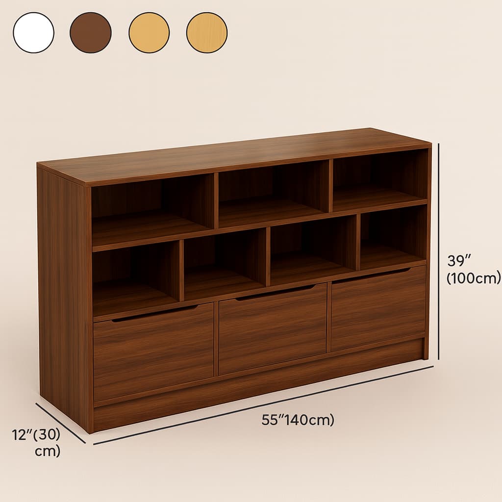 Librero moderno color nogal con compartimentos abiertos y cajones. Funcional, elegante y compacto, ideal para organización y decoración en el hogar u oficina.