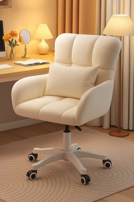 Silla de diseño moderno y elegante en tono rosa pastel, perfecta para espacios como tocadores, comedores o escritorios decorativos. Su estructura combina líneas suaves y respaldo envolvente con un tapizado aterciopelado que aporta un toque de sofisticación. El asiento acolchado ofrece comodidad prolongada, mientras que las patas metálicas en acabado dorado brindan estabilidad y un contraste visual refinado.