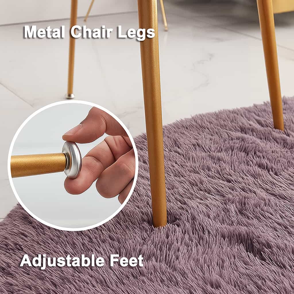 Estructura interna de madera reforzada, tapizado en terciopelo sintético, espuma de alta densidad y patas metálicas con recubrimiento en tono dorado.