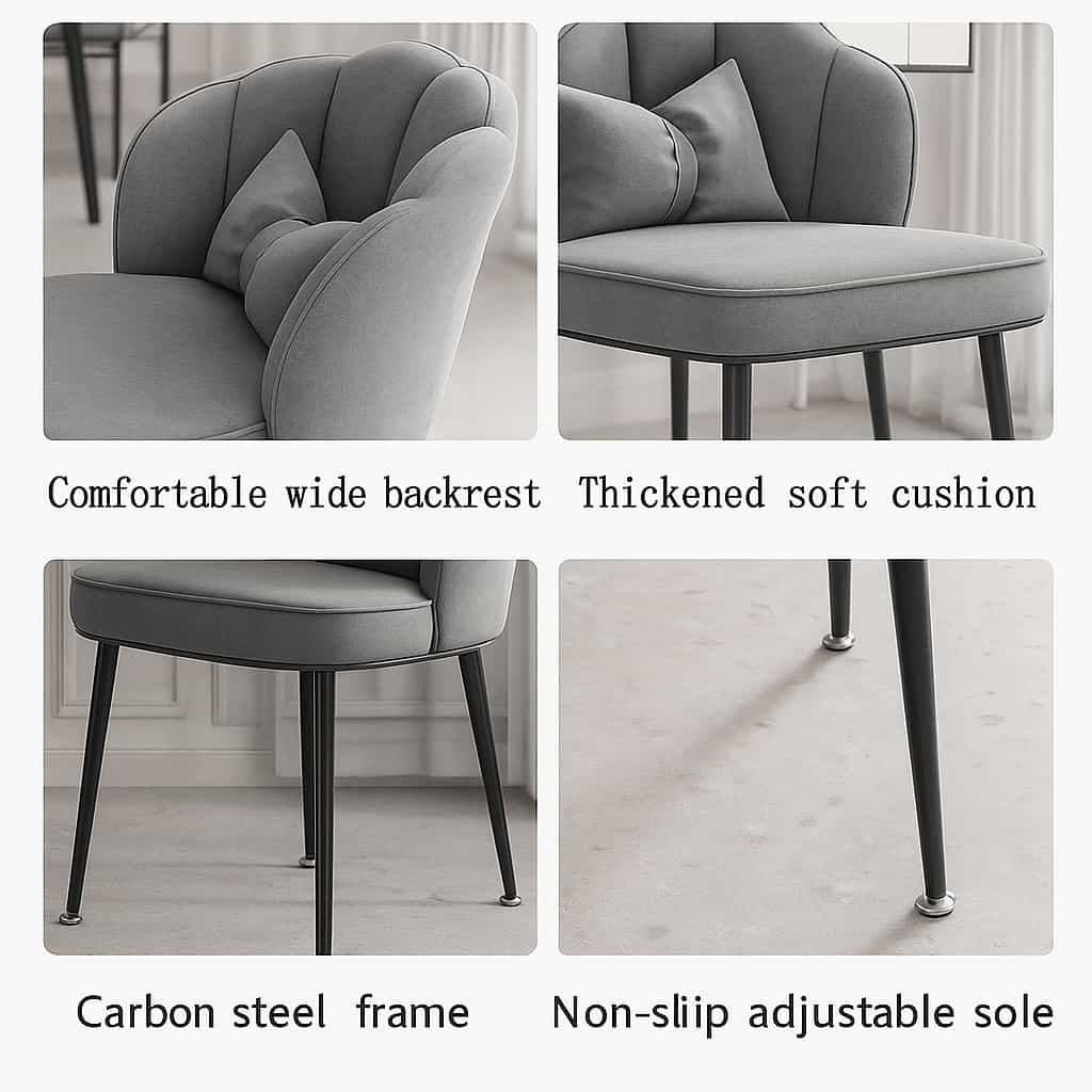 Silla decorativa con respaldo en forma de concha y cojín incluido, tapizada en suave tono gris. Su diseño combina comodidad y estilo contemporáneo, ideal para tocadores, escritorios o espacios modernos. Las patas metálicas negras aportan estabilidad y un contraste elegante con el tono del asiento.