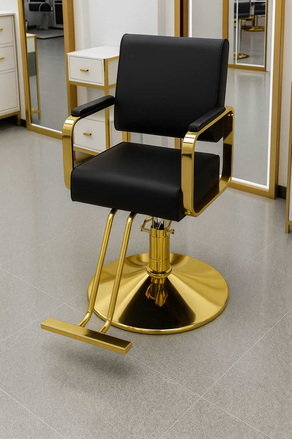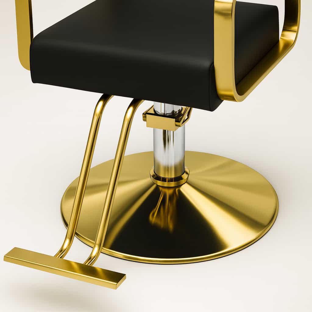 Silla hidráulica profesional de estilo moderno, ideal para salones de belleza, barberías o estudios de estética. Combina comodidad, resistencia y un diseño sofisticado gracias a su estructura metálica dorada de acabado brillante y tapizado negro. Su respaldo y asiento acolchados proporcionan un excelente soporte ergonómico, mientras que la base hidráulica ajustable permite adaptar la altura de manera precisa. Su estética elegante convierte cualquier espacio en un entorno de trabajo distinguido y funcional.