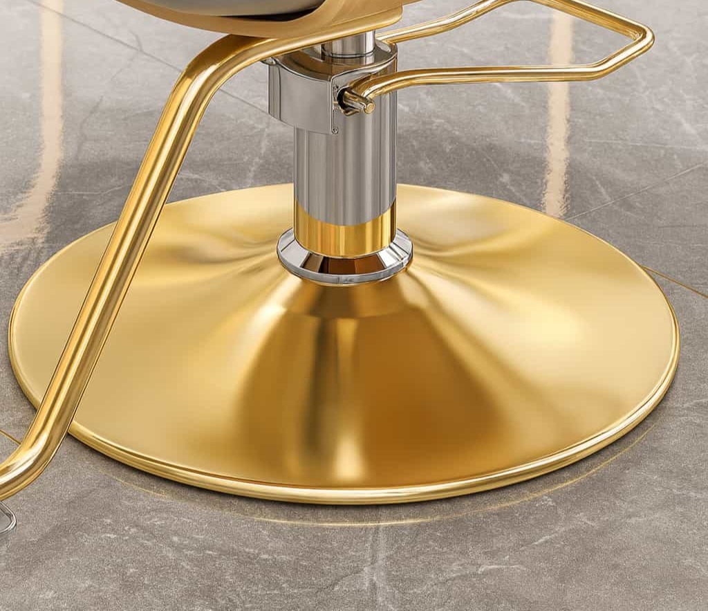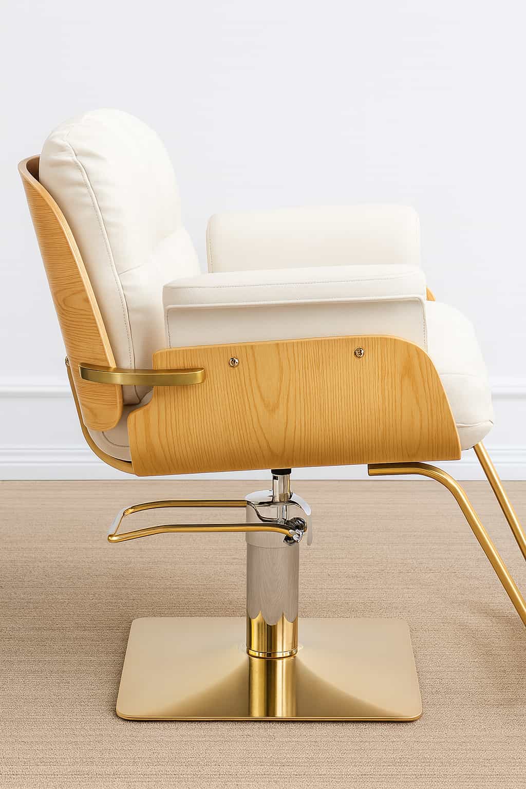 Sillas de salón profesional de diseño moderno y sofisticado, ideales para barberías, peluquerías o estudios de belleza de alta gama. Combinan lujo, comodidad y funcionalidad en una estructura que une madera curvada, tapizado acolchado y detalles metálicos dorados. Su forma ergonómica con apoyabrazos envolventes y asiento amplio garantiza confort durante largas sesiones. La base hidráulica permite ajustar la altura fácilmente, mientras que los acabados en dorado aportan un toque elegante y contemporáneo al espacio.