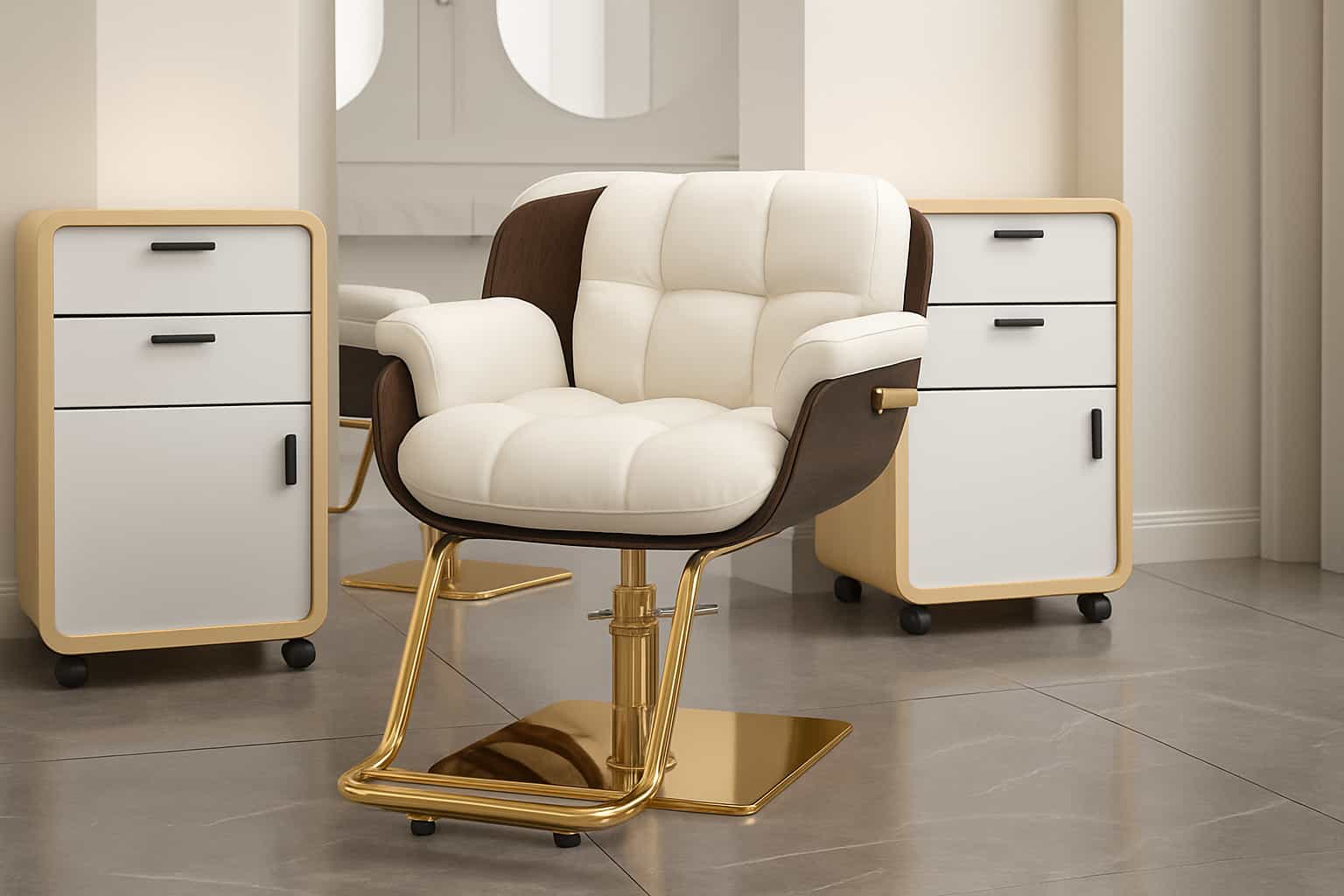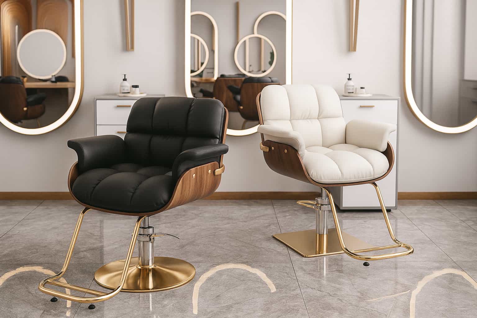 Sillas de salón tapizadas en cuero sintético con estructura de madera y base dorada. Elegantes, ergonómicas y ajustables, ideales para espacios de belleza modernos.