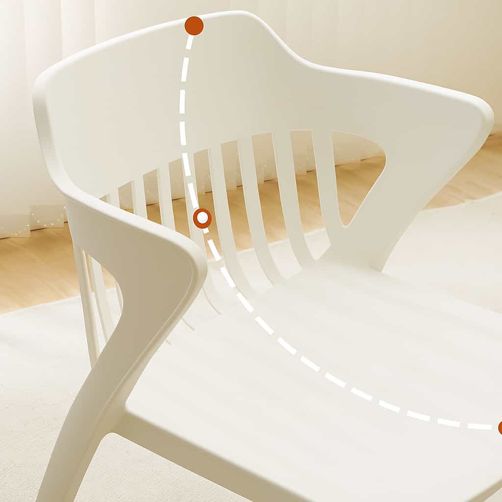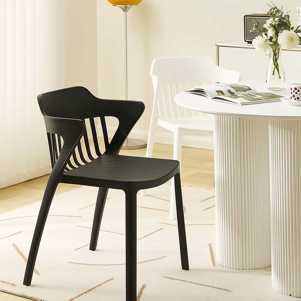 Sillas modernas de diseño ergonómico y contemporáneo, ideales para interiores o exteriores. Fabricadas en una sola pieza de polipropileno reforzado, presentan un respaldo con rejillas verticales que permite ventilación y confort durante el uso. Su forma envolvente brinda soporte lumbar y comodidad, mientras que su estructura resistente garantiza durabilidad. Disponibles en una variedad de tonos neutros y vibrantes, perfectas para comedores, terrazas, cafeterías o espacios de trabajo creativos.