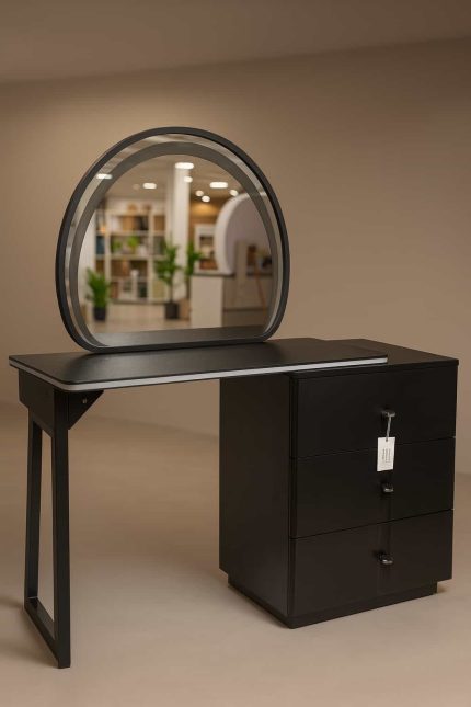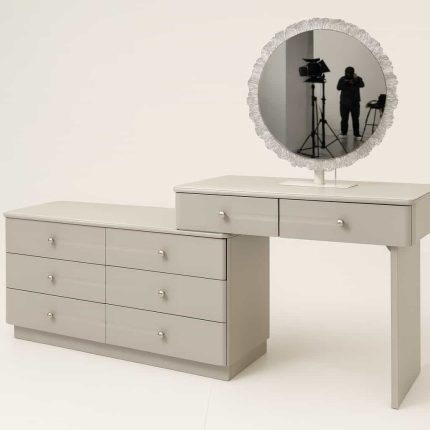 Tocador moderno en acabado blanco con un diseño elegante y líneas curvas decorativas, ideal para dormitorios que buscan un estilo limpio y sofisticado. Su superficie superior es amplia y resistente, perfecta para colocar maquillaje, perfumes y accesorios diarios. El módulo lateral incorpora múltiples gavetas de gran capacidad, distribuidas en un diseño simétrico que facilita la organización. La mesa incluye dos gavetas superiores de fácil acceso con detalles decorativos grabados que aportan un toque distintivo al conjunto. El espejo circular con marco blanco complementa la estética del tocador, ofreciendo excelente visibilidad y una presencia visual armoniosa.