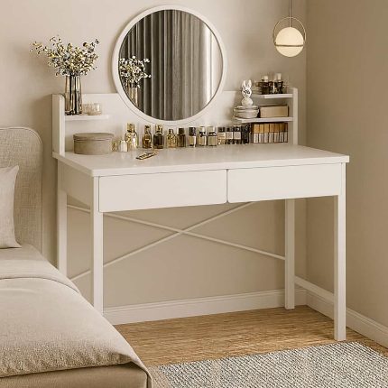 Tocador blanco con diseño decorativo, múltiples gavetas y espejo circular, ideal para maquillaje y organización con estilo moderno y elegante.