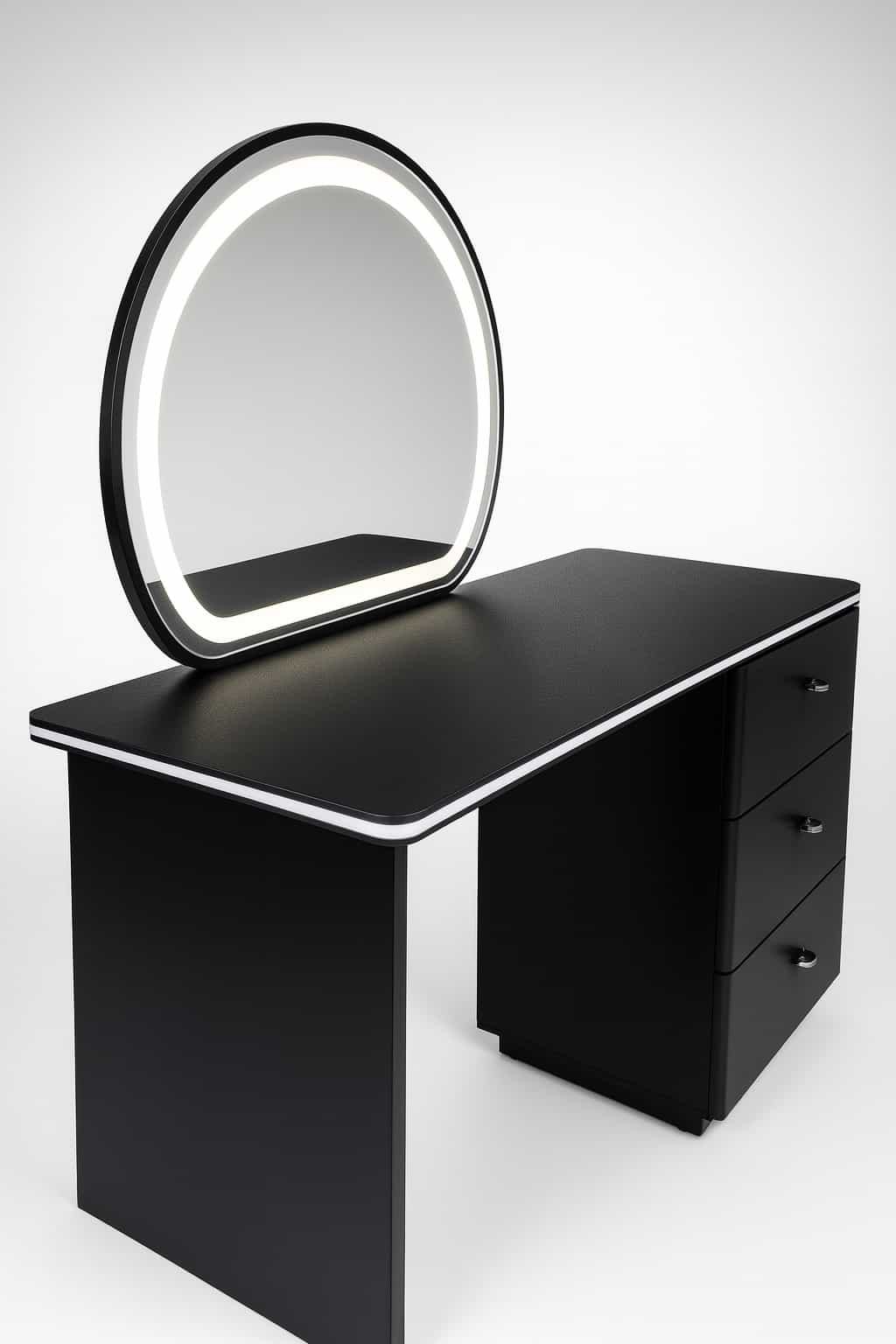 Tocador moderno negro con espejo redondo y tres gavetas amplias, ideal para maquillaje o trabajo con un estilo minimalista y elegante.