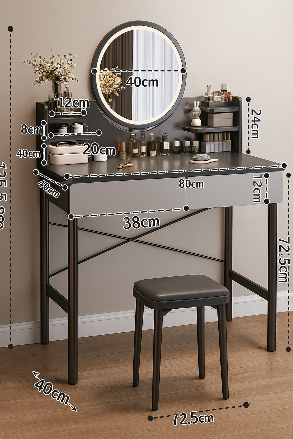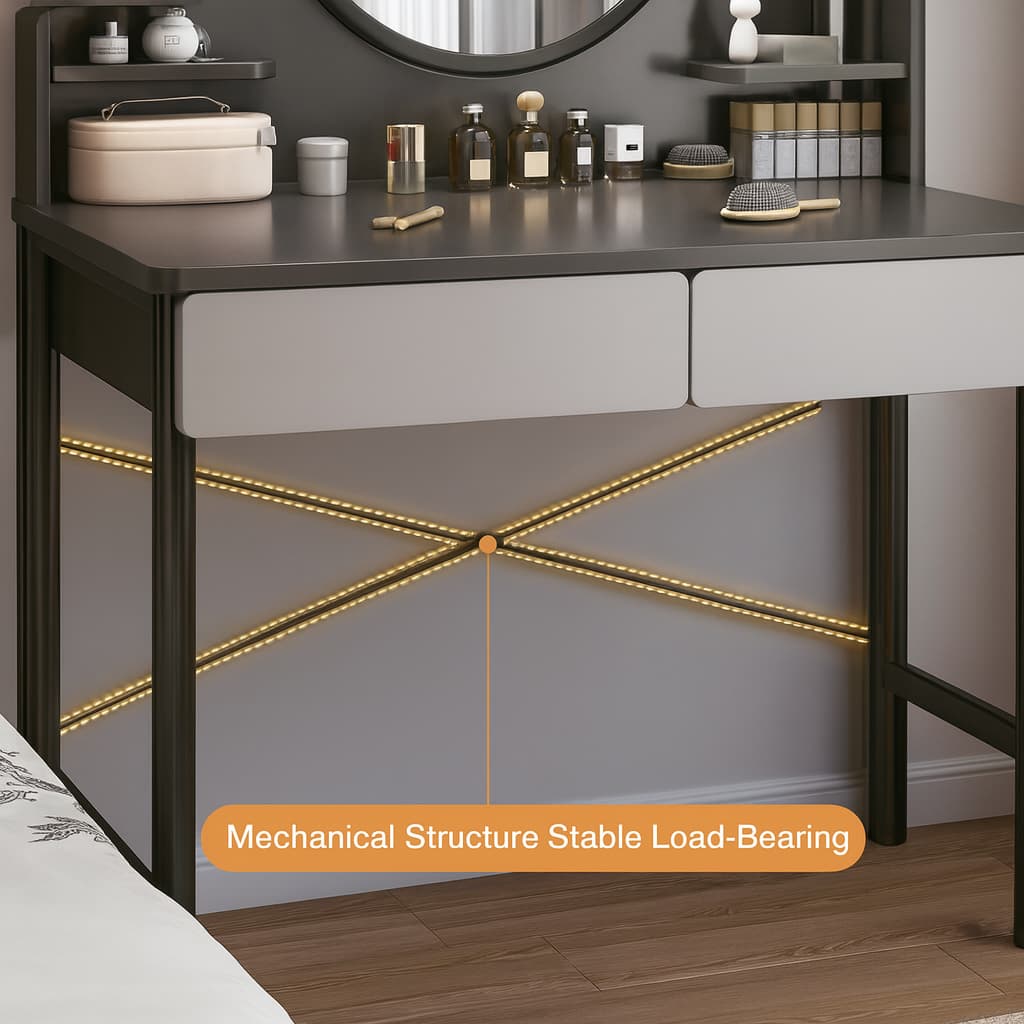 Tocador moderno de diseño compacto y elegante, ideal para dormitorios o espacios reducidos. Su estructura en tonos gris oscuro y gris perla crea una estética sobria y contemporánea. Cuenta con una superficie amplia para maquillaje o accesorios, un espejo circular de alta definición y compartimentos superiores abiertos que facilitan la organización de cosméticos y artículos personales. Los dos cajones inferiores ofrecen almacenamiento adicional, mientras que la base metálica negra con refuerzos cruzados garantiza estabilidad y durabilidad.