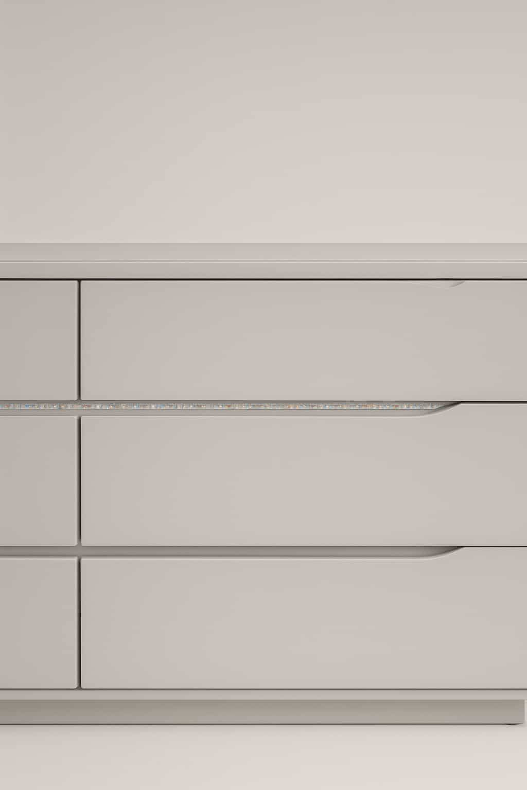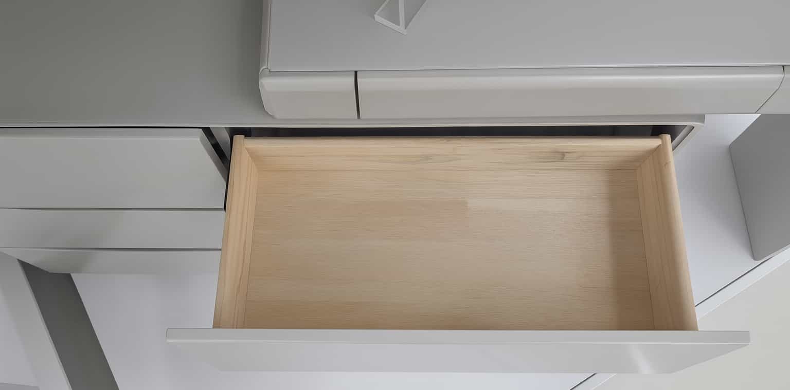 Gavetas sin tiradores visibles, con diseño tipo “uñero” moderno.
