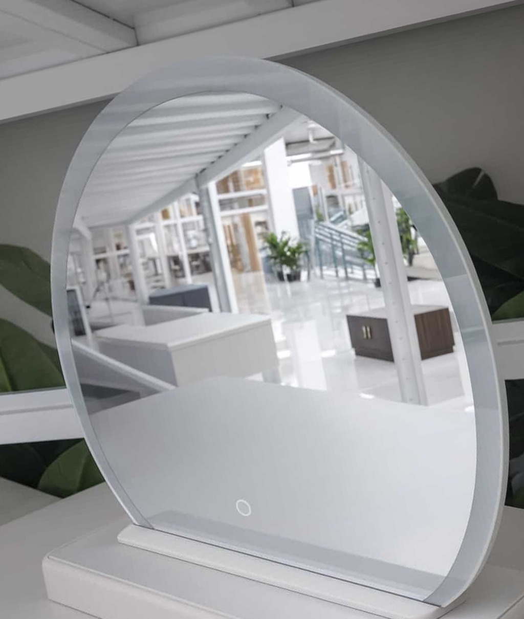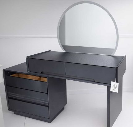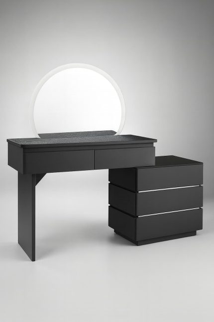 Tocador minimalista con espejo semicircular y gavetas tipo uñero, ideal para maquillaje y organización moderna.