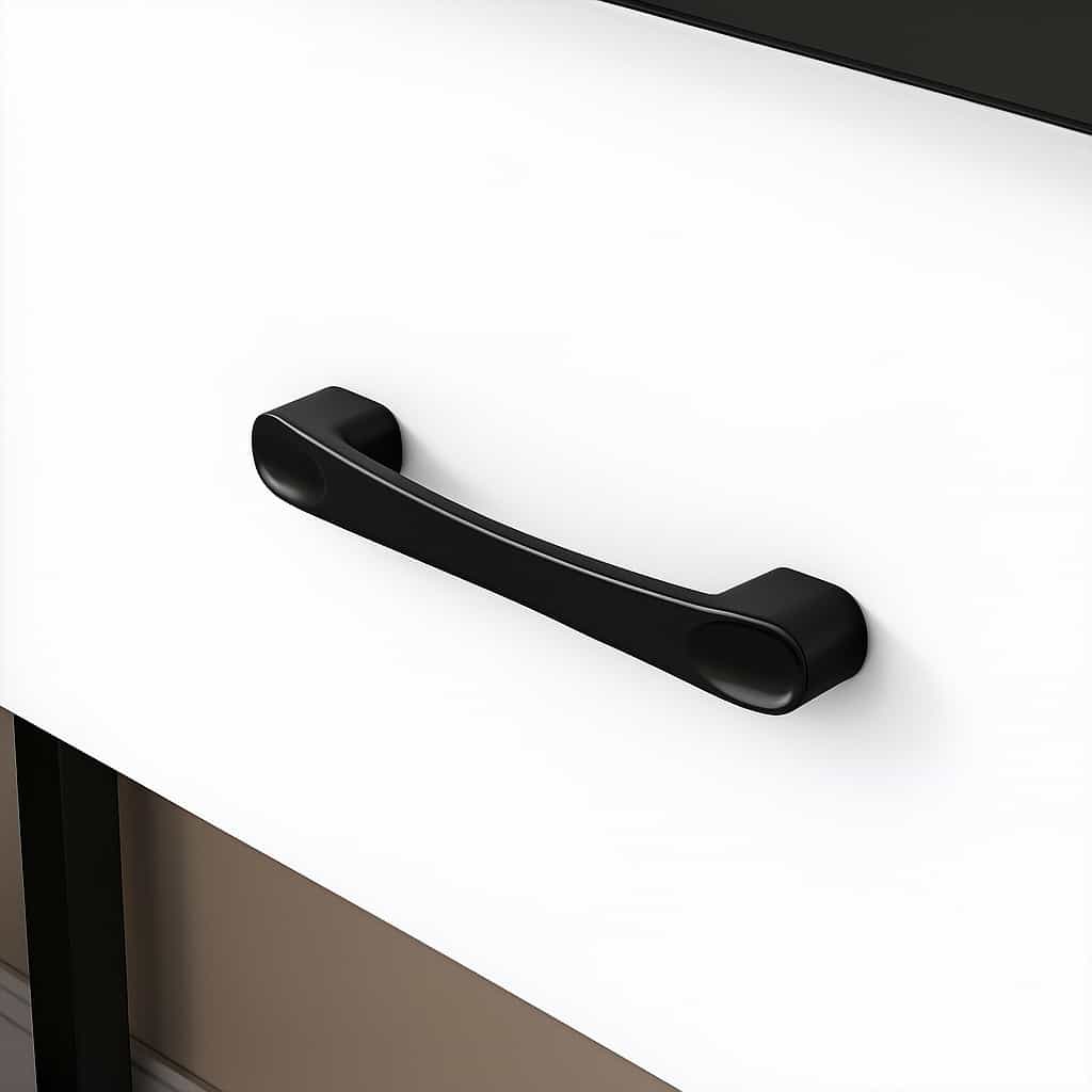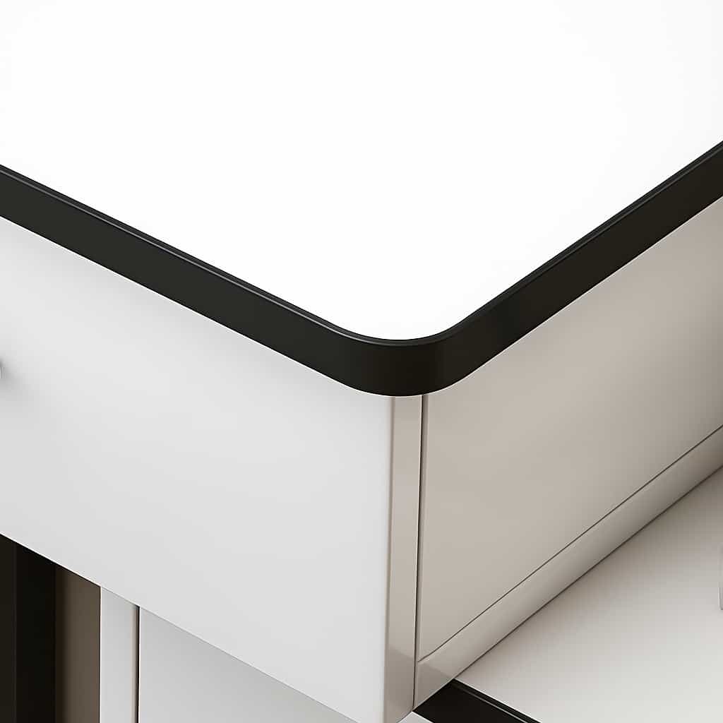 Fabricado en MDF de alta calidad con acabado lacado en blanco brillante y estructura metálica negra que proporciona estabilidad y durabilidad.